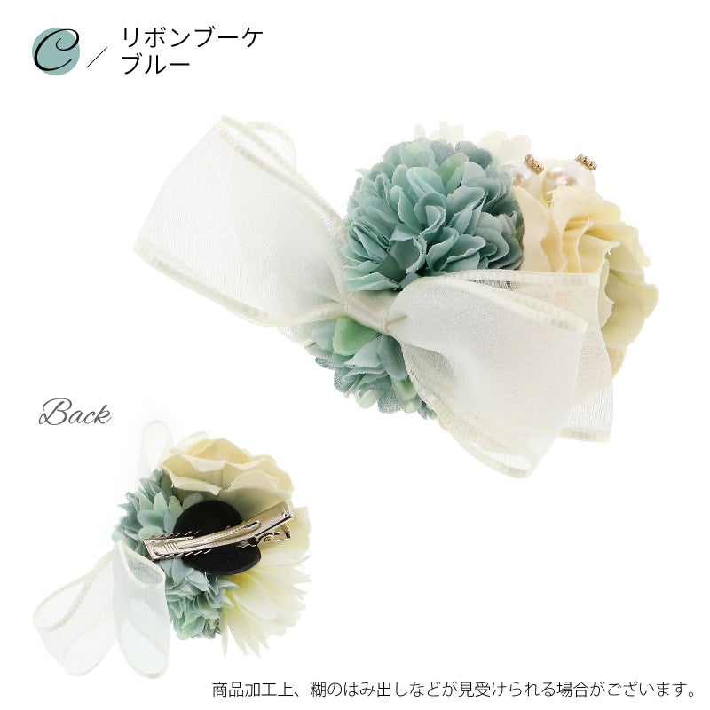 C.リボンブーケ ブルー…クリーム色にブルーグレーの挿し色のお花、浅い水色、白のマム、パールビーズ、オフホワイトのリボン。