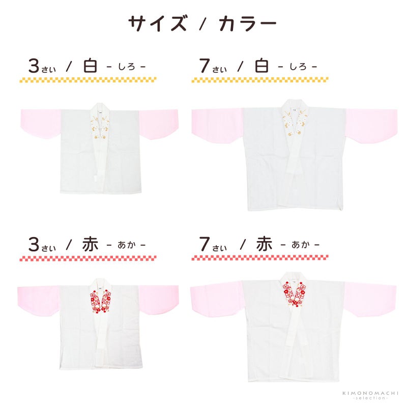 七五三にも卒園式や入学式などお子様の和装に使える便利は半えり付き半襦袢です。選べる2カラー2サイズをご用意!