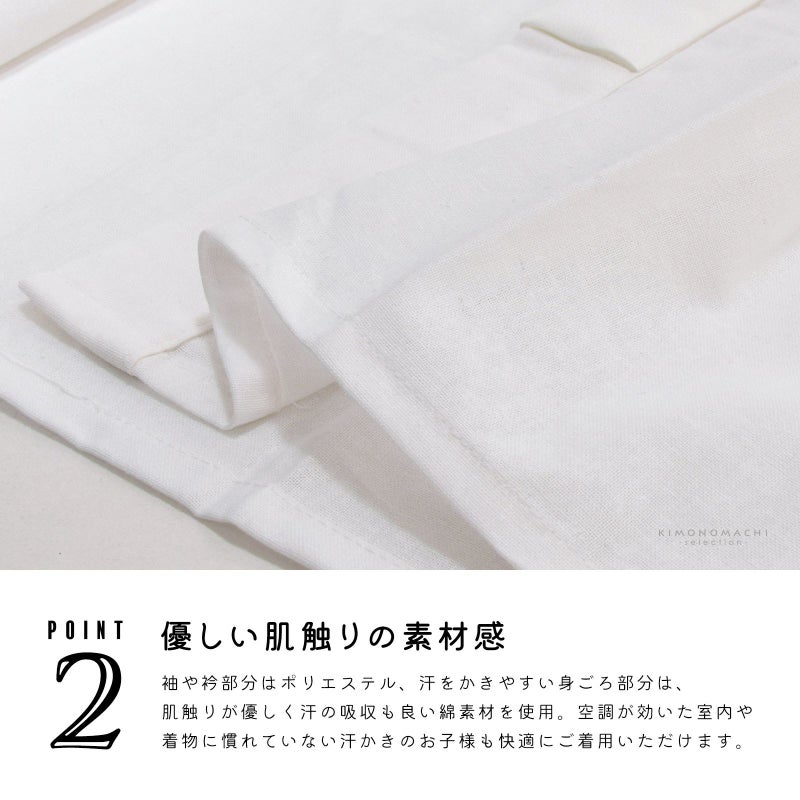 袖や衿部分はポリエステル、汗をかきやすい見ごろ部分は、肌触りが優しく汗の吸収も良い綿素材を使用。空調が効いた室内や着物に慣れない汗かきのお子様も快適にご着用いただけます。