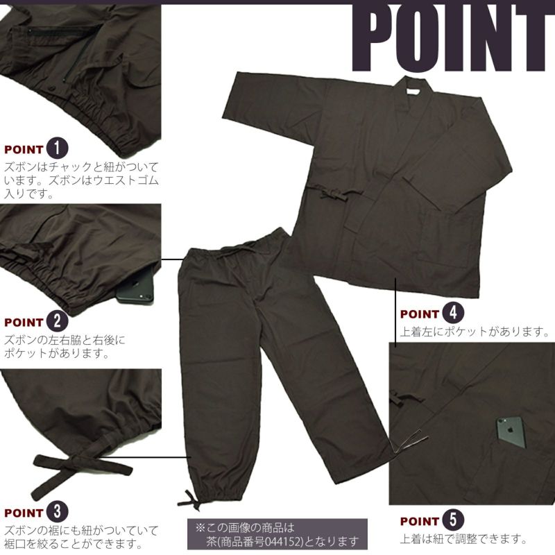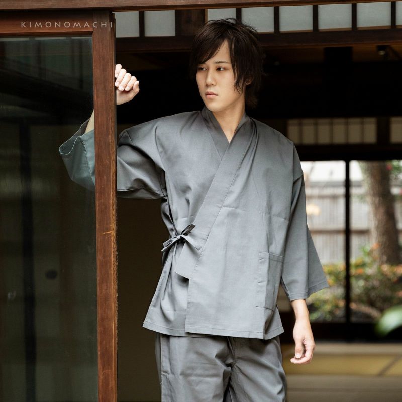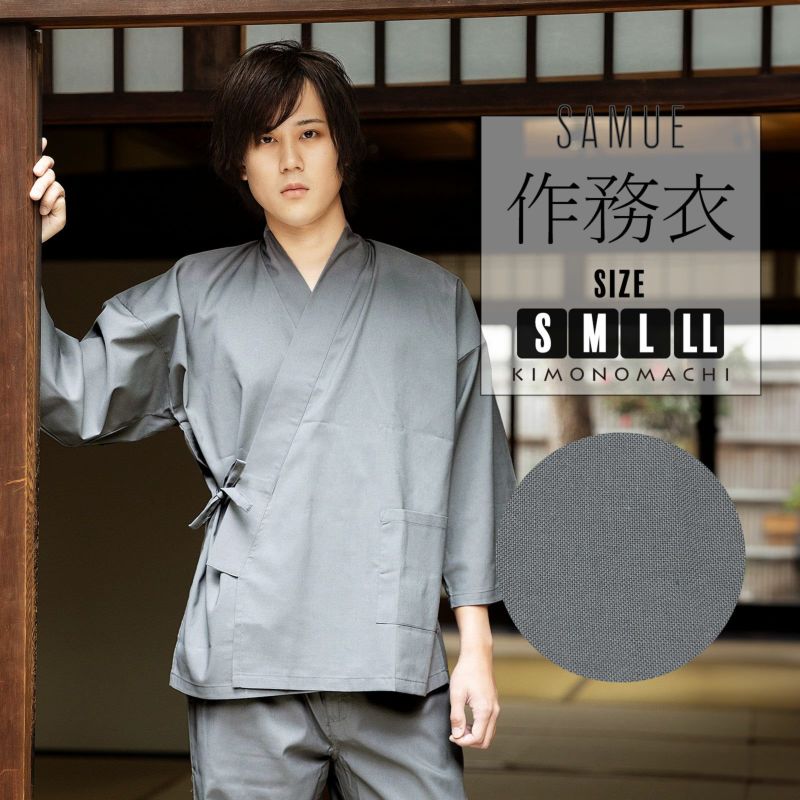 綿ポリ素材の、通年で着ていただける作務衣です。上着、ズボンの上下に分かれています。