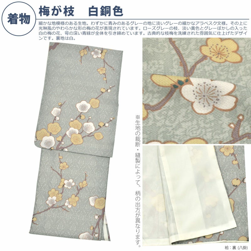 着物:細かな地模様のある生地。わずかに青みのあるグレーの地に淡いグレーの細かなアラベスク文様。その上に光琳風のやわらかな形の梅の花が表現されています。ローズグレーの枝、淡い黄色とグレーぼかしの入った白の梅の花、萼の深い青緑が全体を引き締めています。古典的な枝梅を洗練された雰囲気に仕上げたデザインです。裏地は白。