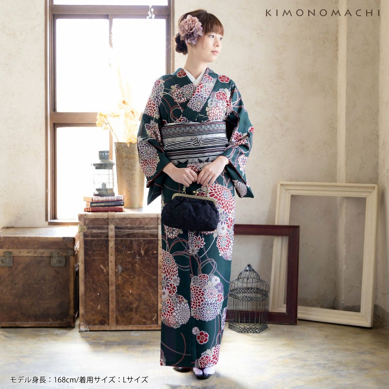 着物:細かな地模様のある生地。深い青緑色の地に薄茶の輪郭線で大きな花の薬玉文様が表現されています。白、赤、浅い青緑、薄ベージュ、藤鼠色の抽象的な菊や桜の花々、間を流れる組紐がデザインに動きを生み出しています。大胆な古典文様が甘すぎない配色で表現されています。裏地は赤。