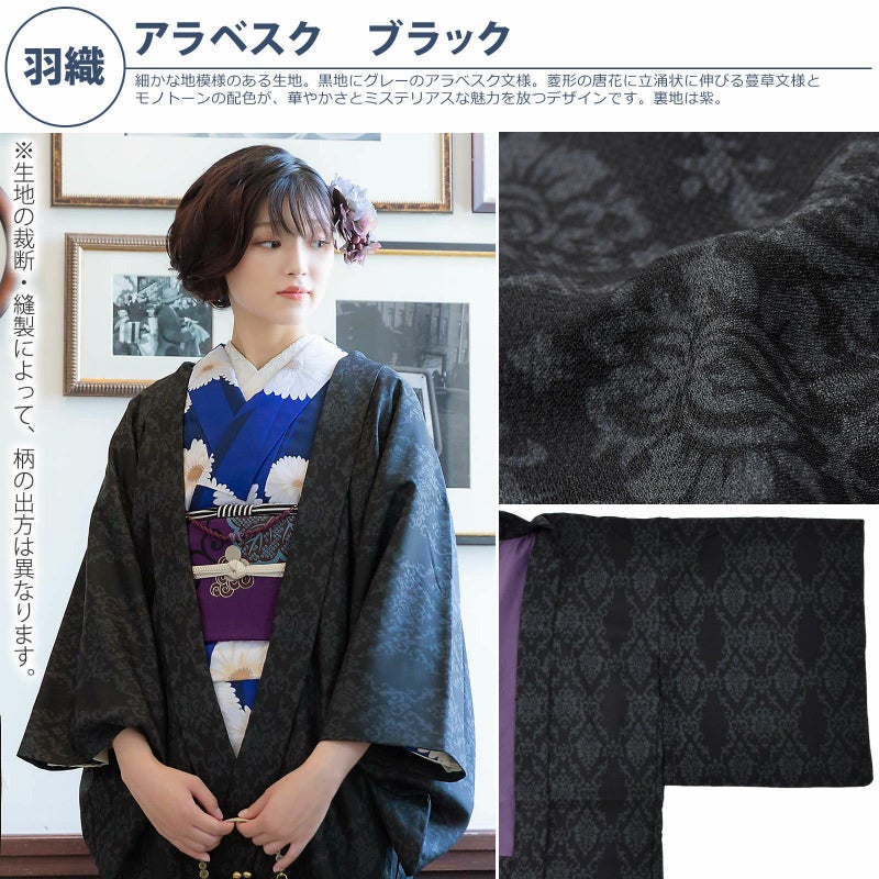 羽織:細かな地模様のある生地。黒地にグレーのアラベスク文様。菱形の唐花に立涌状に伸びる蔓草文様とモノトーンの配色が、華やかさとミステリアスな魅力を放つデザインです。裏地は紫。