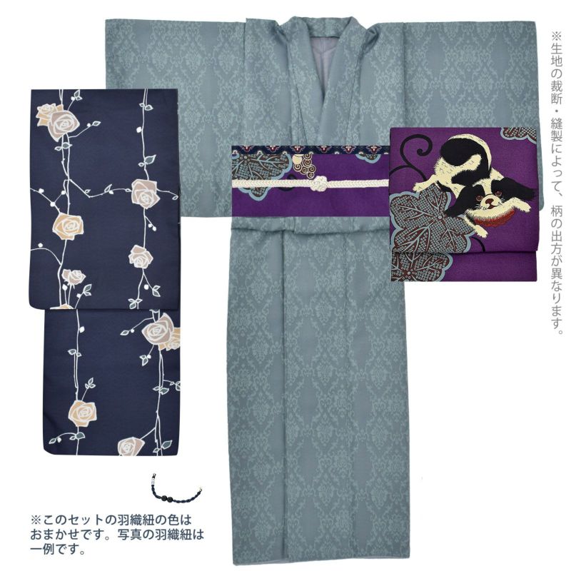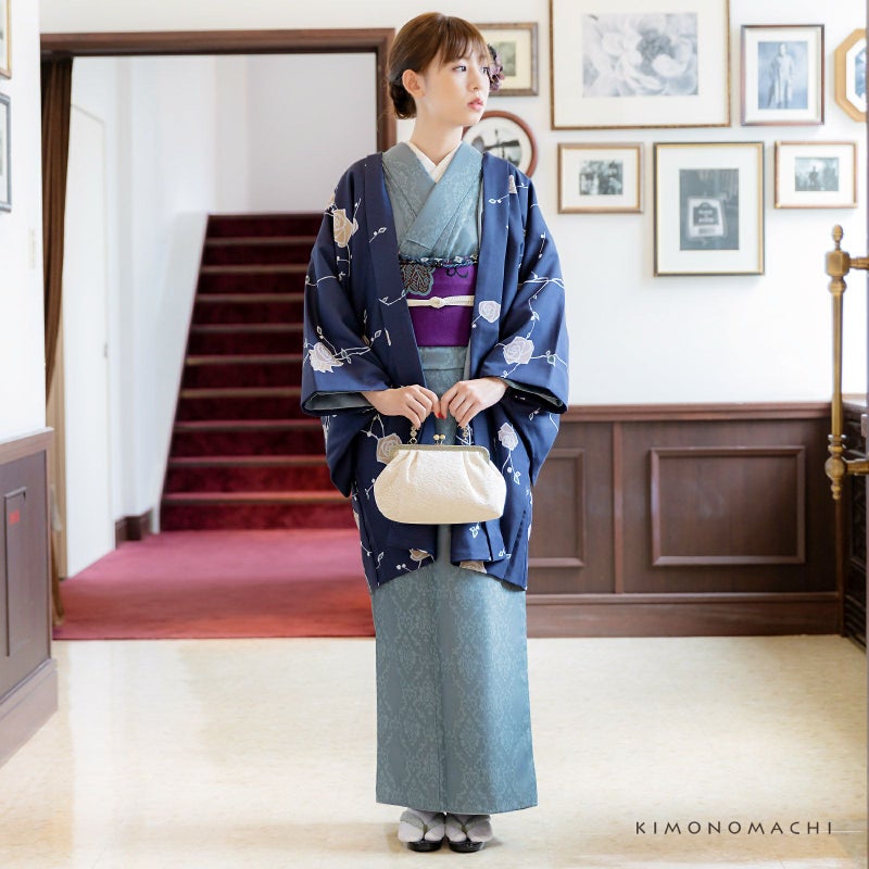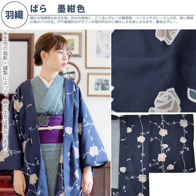 羽織:細かな地模様のある生地。灰みの紺地に、ごく淡いグレーの輪郭線、ベージュやグレージュの花、深い青緑の葉のバラの花。やや直線的なデザインが現代的な中に懐かしさを感じさせます。裏地はグレー。