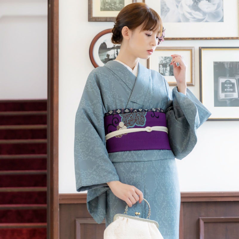 袷着物:細かな地模様のある生地。青緑みのグレーの地にグレイッシュな水色のアラベスク文様。菱形の唐花に立涌状に伸びる蔓草文様とターコイズ系のブルーグレーが、オリエンタルな優美さを感じさせるデザインです。裏地はグレー。