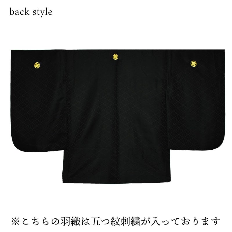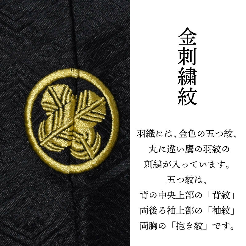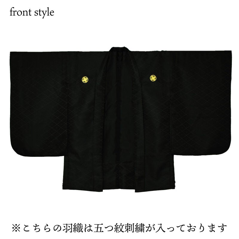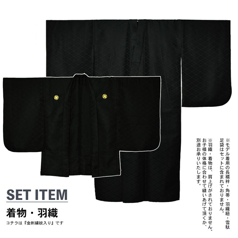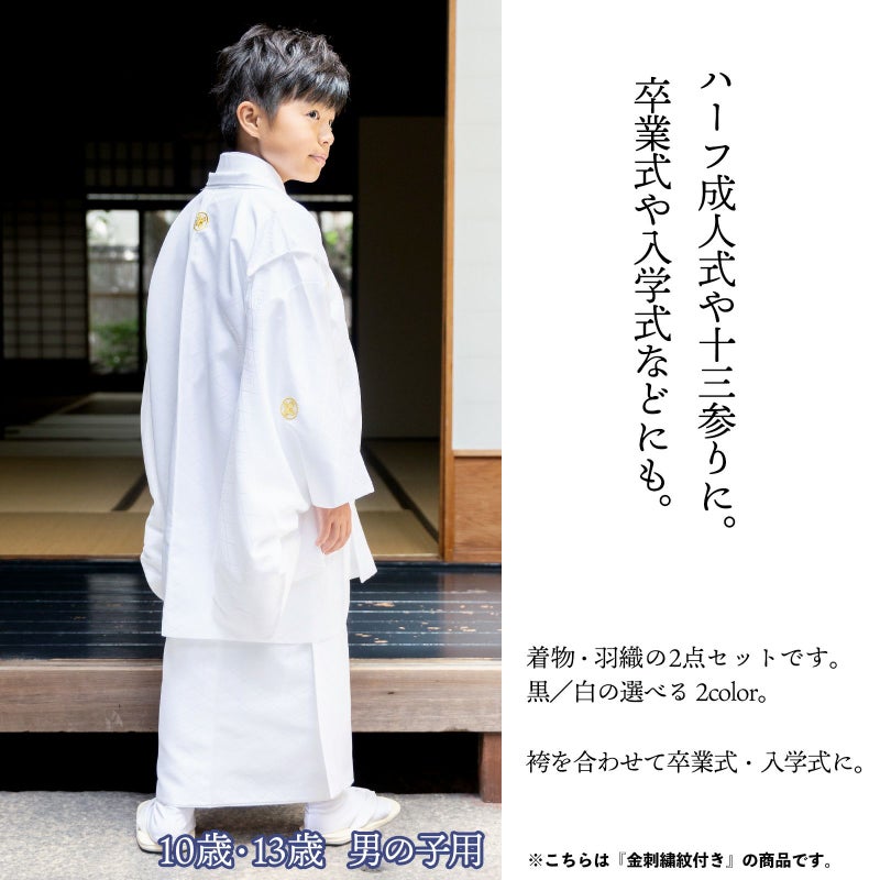 10歳、13歳の男の子に。羽織に金の刺繍紋が入った羽織と着物のセットです。袴を合わせて卒業式、入学式に!ハーフ成人式、十三参り、お正月にも。