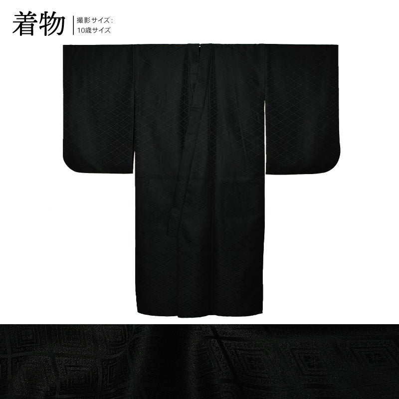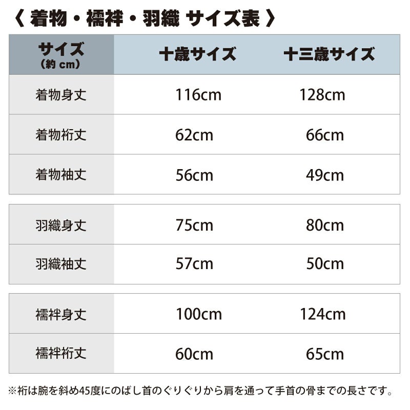 ※13歳用は、袖のつくりが成人男性の着物と同様になっており、袖丈は短めに、脇や袖は閉じられており、身八つ口も振りもありません。(モデルは10歳用を着用しております)