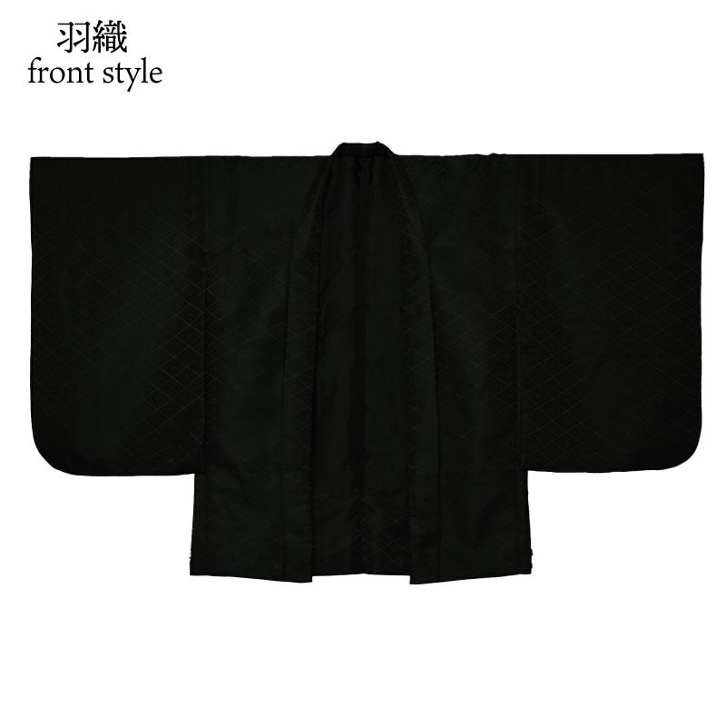 黒 菱…羽織は黒。入れ子菱に花菱の地模様が織り出されています。着物は羽織と同じ地模様の黒。
