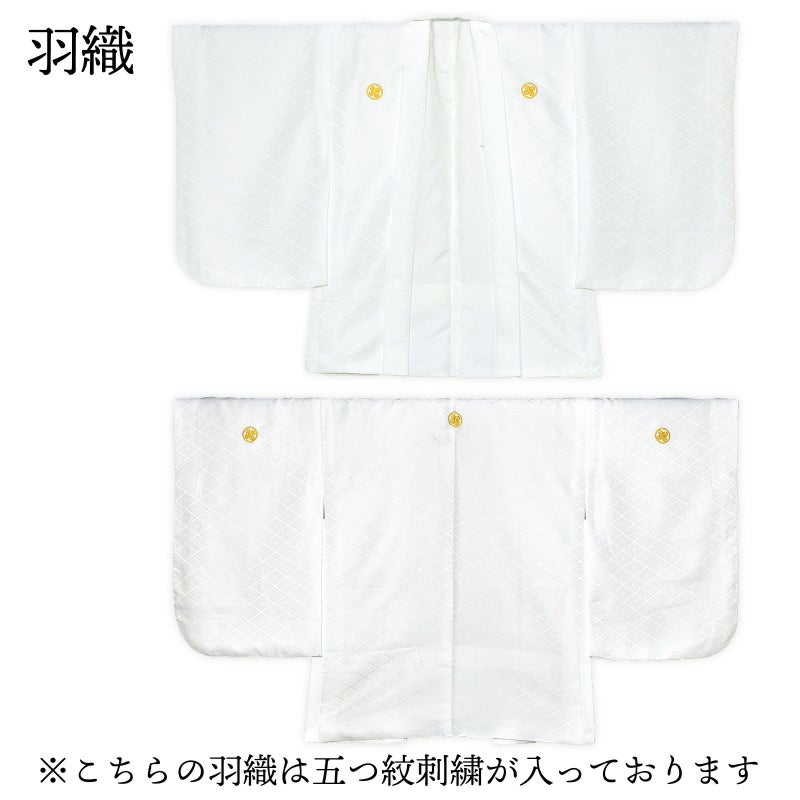 羽織は白。入れ子菱に花菱の地模様が織り出されています。金の違い鷹の羽の刺繍紋。着物は羽織と同じ地模様の白。