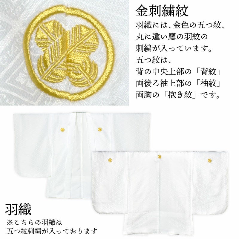 羽織は白。入れ子菱に花菱の地模様が織り出されています。金の違い鷹の羽の刺繍紋。着物は羽織と同じ地模様の白。