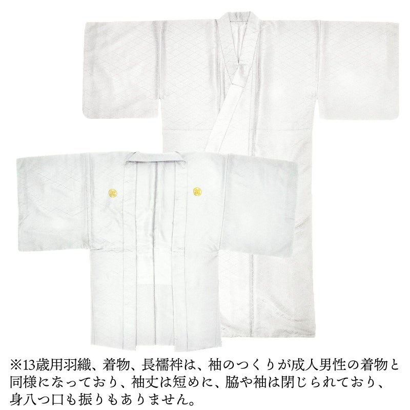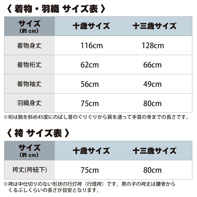※13歳用は、袖のつくりが成人男性の着物と同様になっており、袖丈は短めに、脇や袖は閉じられており、身八つ口も振りもありません。(モデルは10歳用を着用しております)
