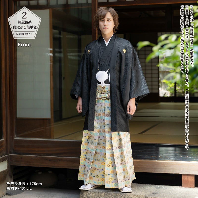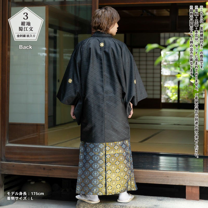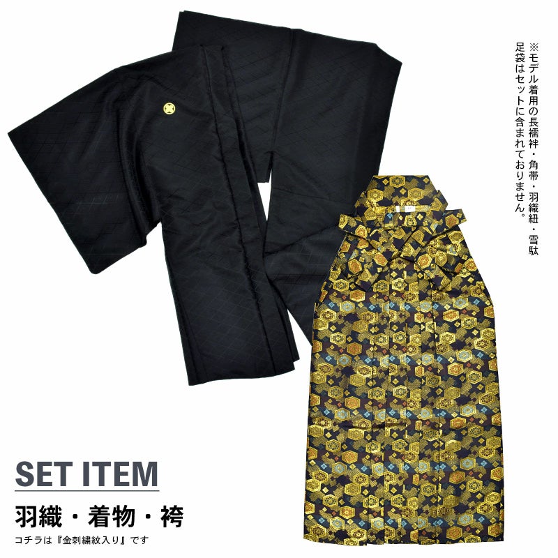 羽織に金の刺繍紋が入った紋付袴セットです。お仕立て上がりですので、すぐにご着用いただけます。