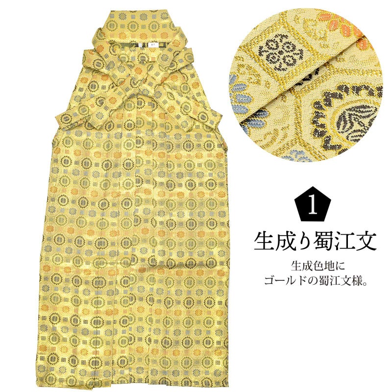 1生成り蜀江文:生成色地にゴールドの蜀江文様。その中にくすんだ橙色、抹茶色、水色、紺などの花菱や唐花文。