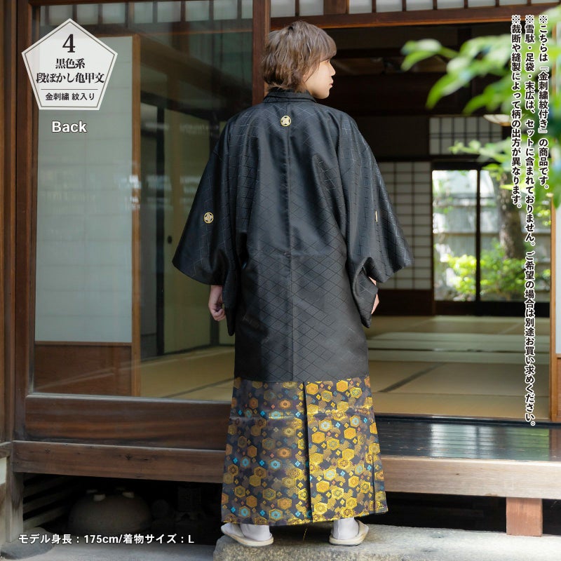 4黒色系段ぼかし亀甲文:黒、濃紺、濃い茶色の段ぼかしの地にゴールドの亀甲文。橙色や水色、深緑、茶色の菊花や花菱などの模様。