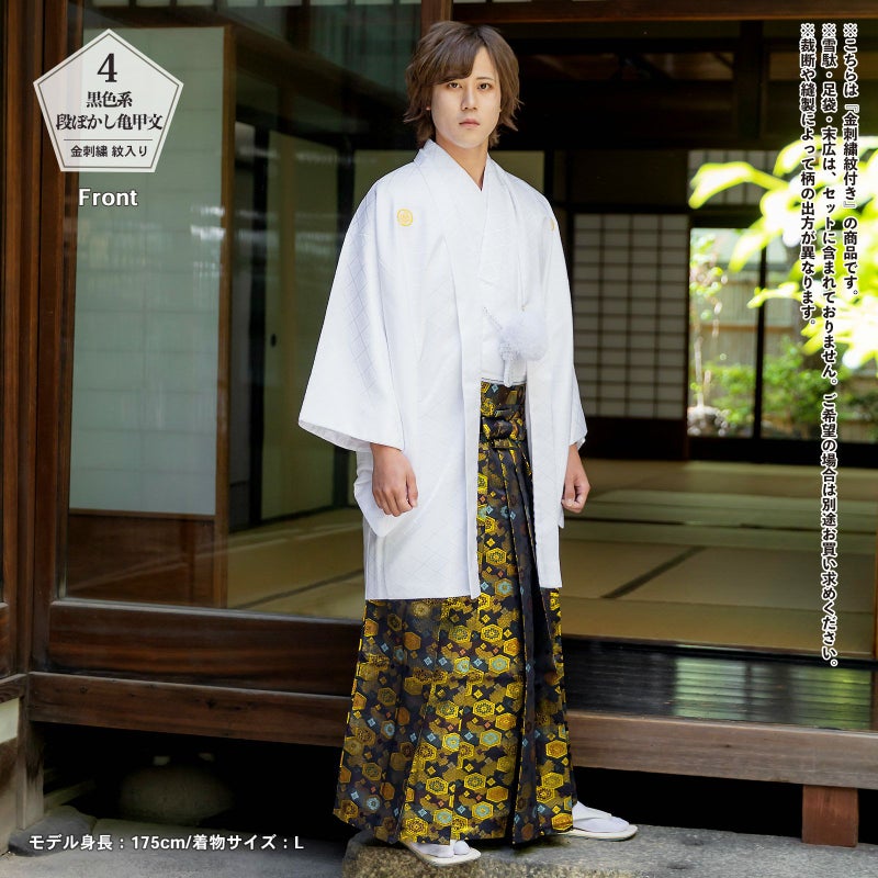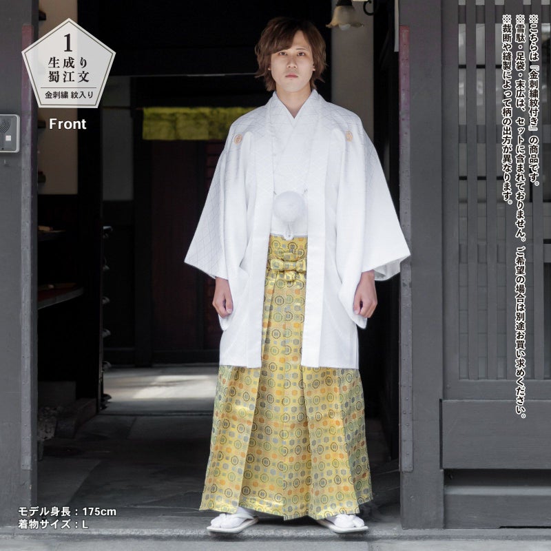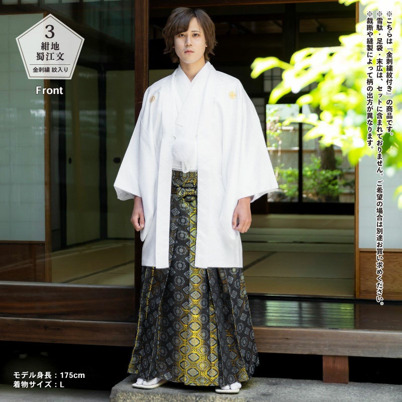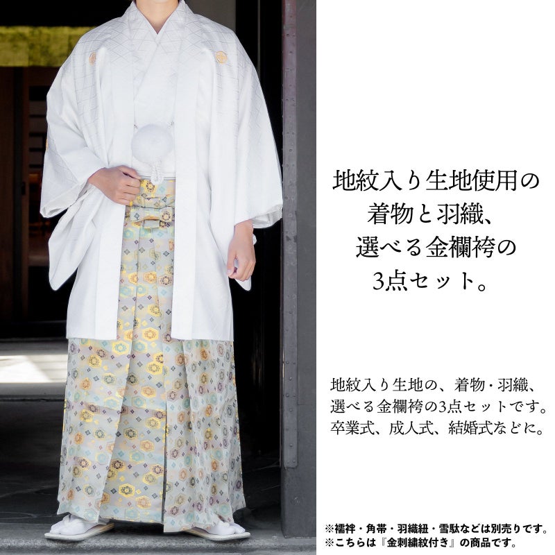 羽織に金の刺繍紋が入った紋付袴セットです。お仕立て上がりですので、すぐにご着用いただけます。