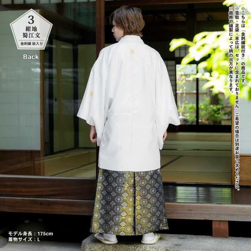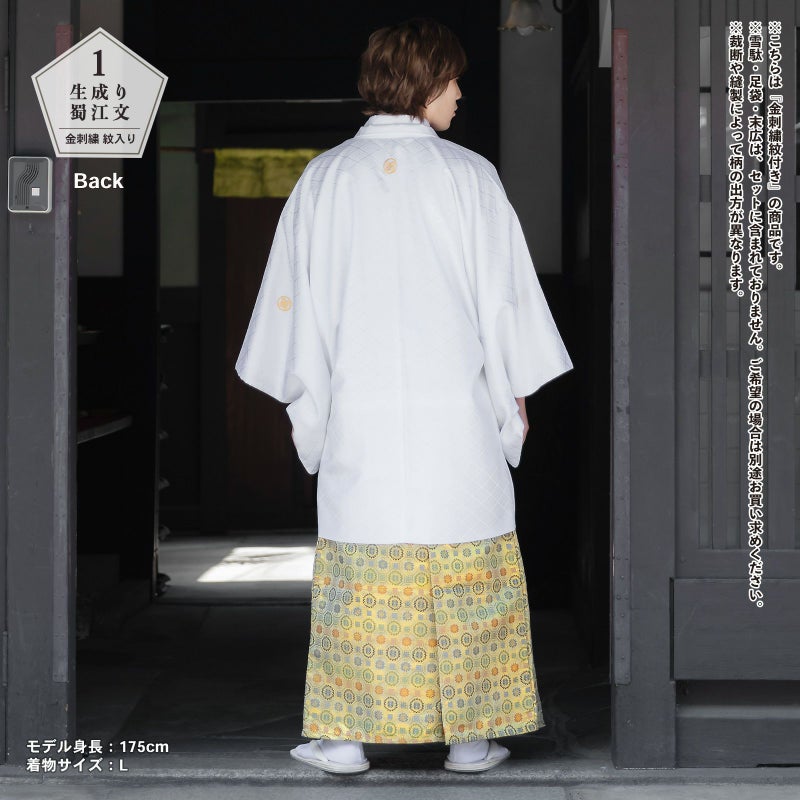 羽織は白。入れ子菱に花菱の地模様が織り出されています。金の違い鷹の羽の刺繍紋。着物は羽織と同じ地模様の白。