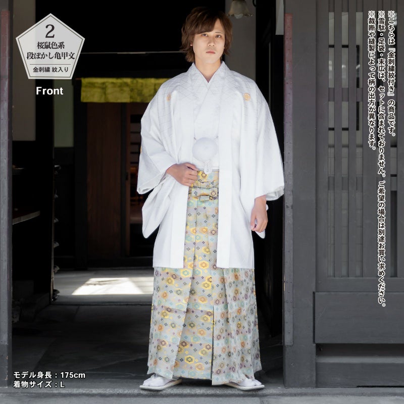 2桜鼠色系段ぼかし亀甲文:桜鼠色、灰みの薄水色、ごく浅い藤色などの段ぼかしの地にゴールドの亀甲文。橙色や水色、深紫、深緑色の菊花や花菱などの模様。