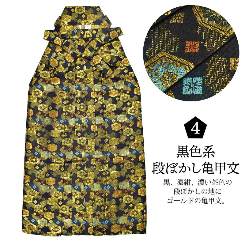4黒色系段ぼかし亀甲文:黒、濃紺、濃い茶色の段ぼかしの地にゴールドの亀甲文。橙色や水色、深緑、茶色の菊花や花菱などの模様。