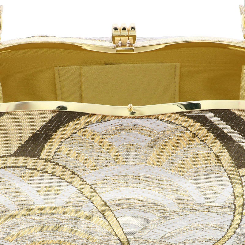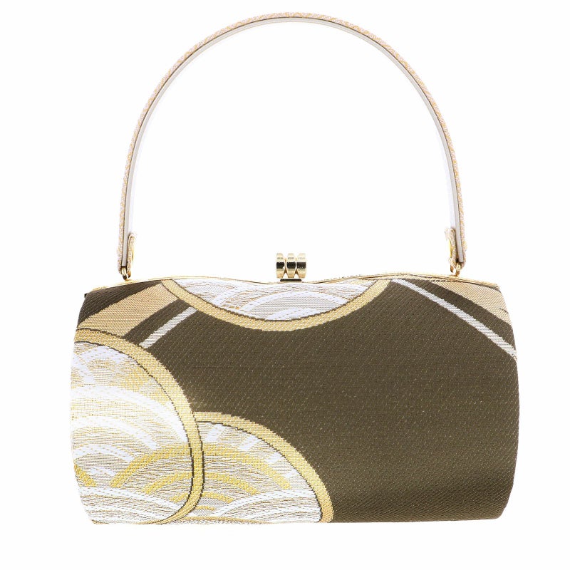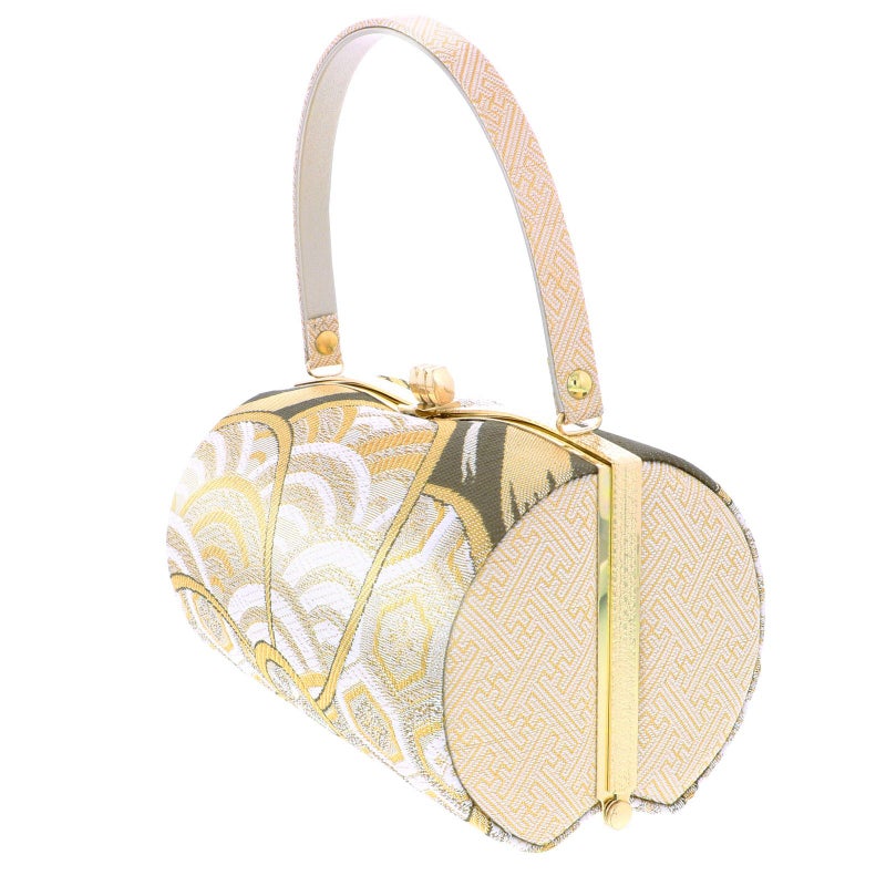 【色柄】バッグの本体は、グレイッシュな浅い茶色地に白、ゴールドを基調とした、青海波や亀甲などの吉祥紋を詰めた大きなねじ花。持ち手は白地に金の紗綾形。口金はゴールド。草履の鼻緒はバッグと共生地。草履の台はプラチナゴールド。