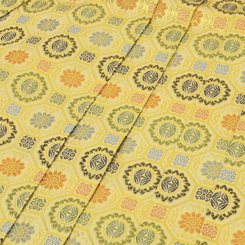 【色柄】生成色地にゴールドの蜀江文様。その中にくすんだ橙色、抹茶色、水色、紺などの花菱や唐花文。