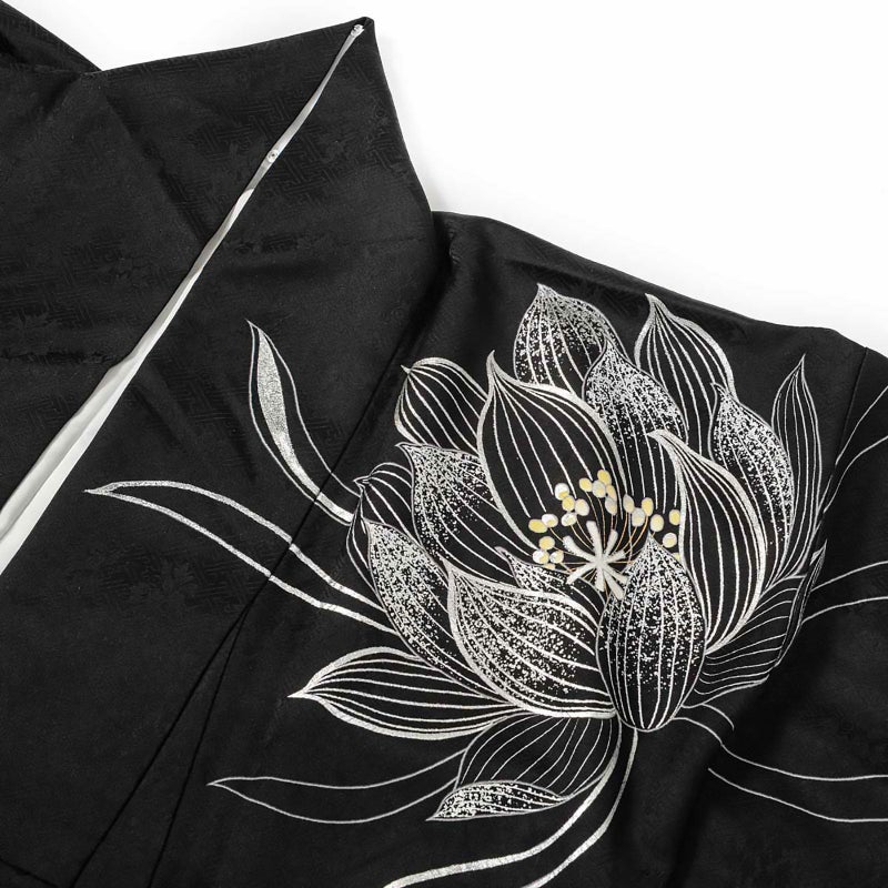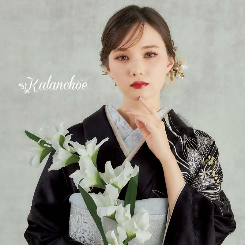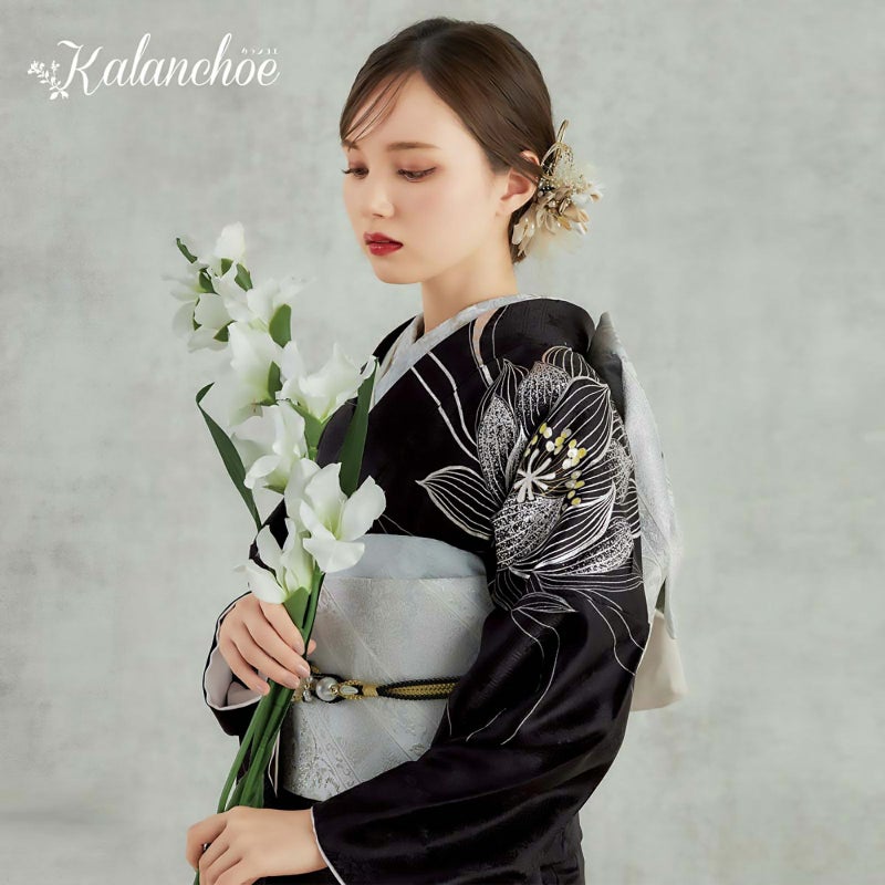 漆黒の生地に銀彩で描かれた”月下美人”一夜限りしか咲かないその儚さと、咲いた花の可憐さをシンプルに大胆に描き出した金彩友禅の振袖はほかにはなく、唯一無二とお着物です。カランコエブランドの新しいシーンで貴女をより輝かせます。