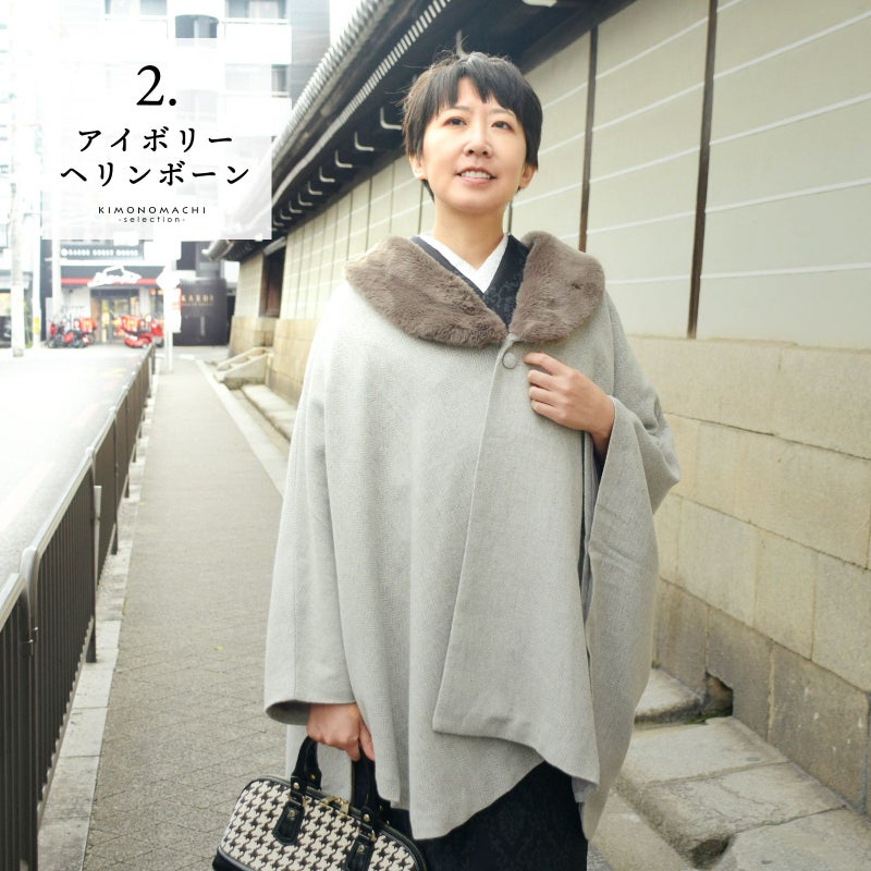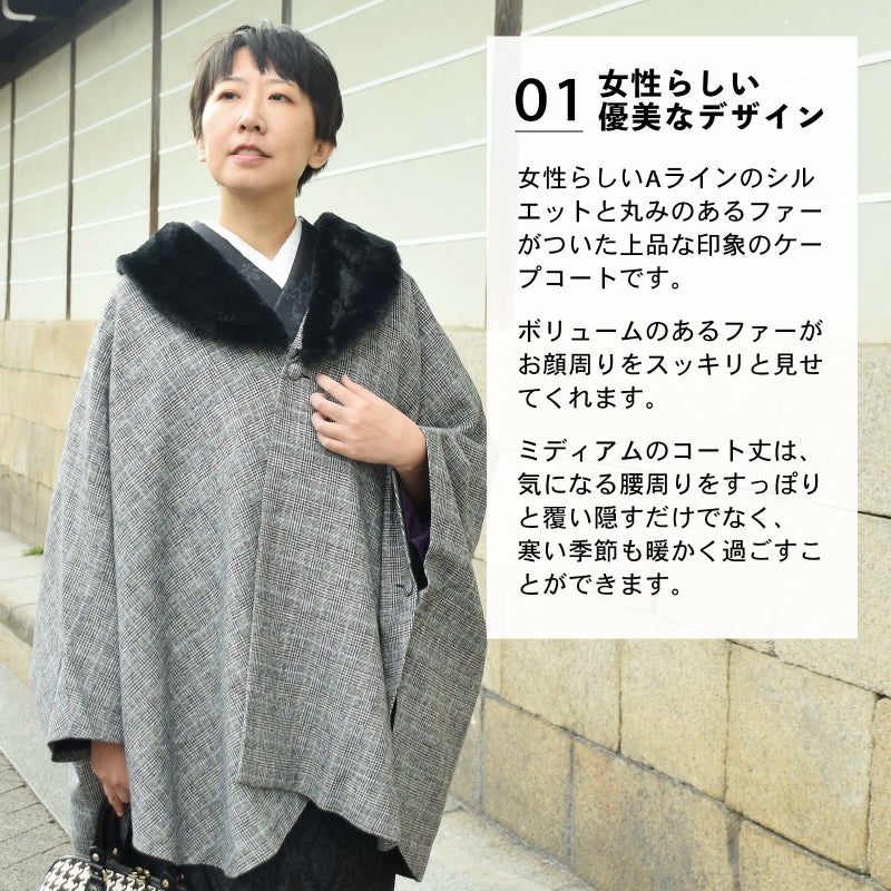Aラインの女性らしいシルエットと衿元のふわふわなファーが上品な印象のケープコートです。雰囲気が異なる3柄をご用意。