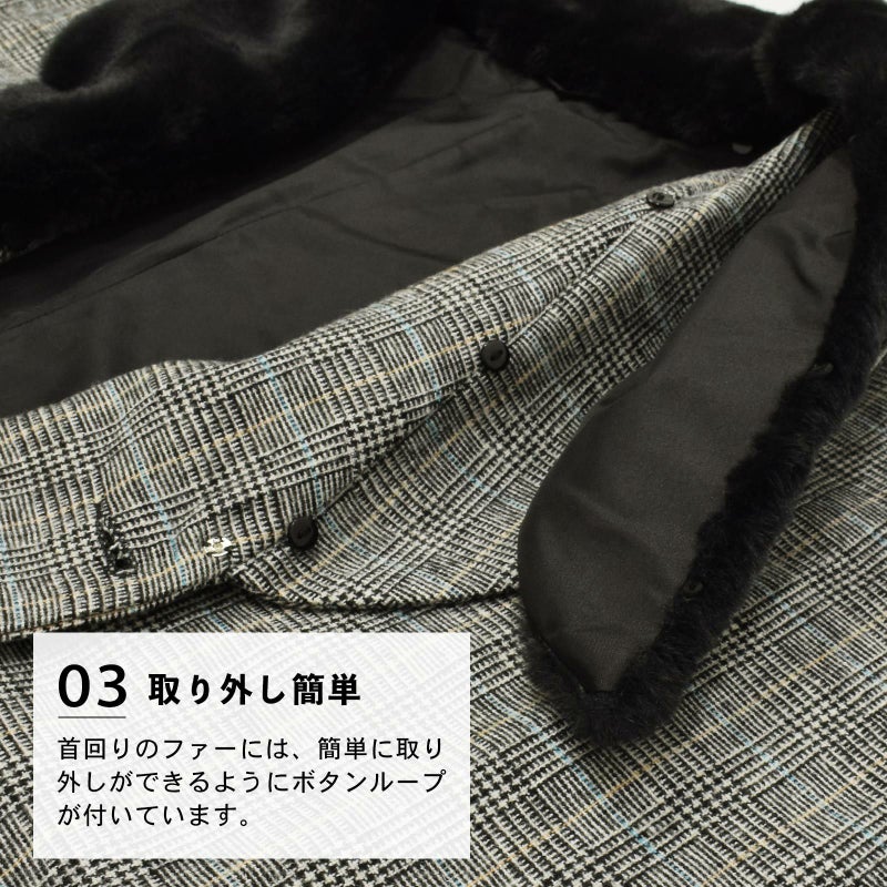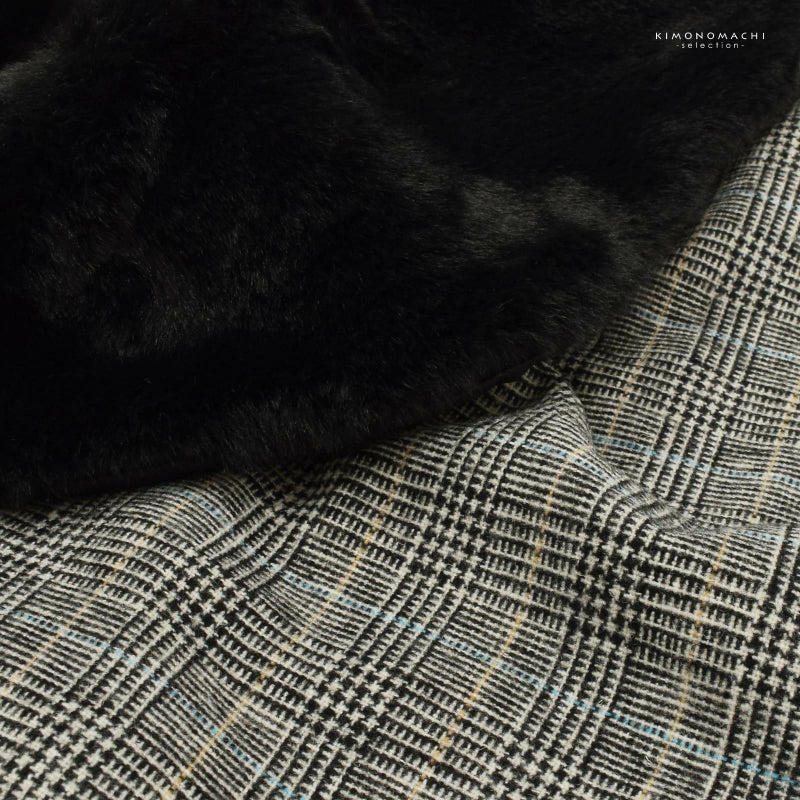 3.黒白 グレンチェック:身頃は黒白のグレンチェックに淡いベージュと水色の細い格子。衿に黒のファー。