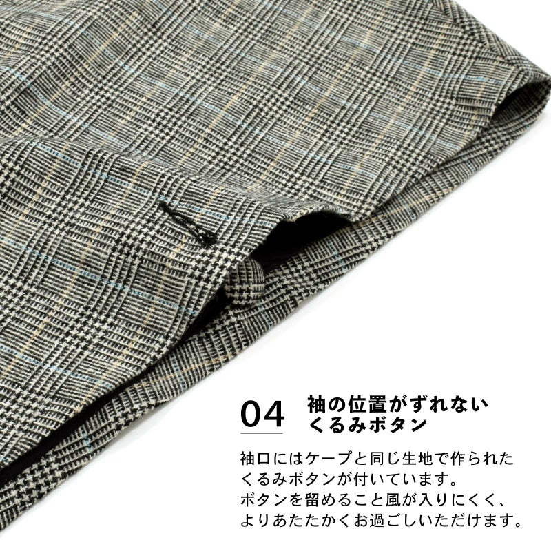 袖口にはケープと同じ生地で作られたくるみボタンが付いています。ボタンを留めること風が入りにくく、よりあたたかくお過ごしいただけます。
