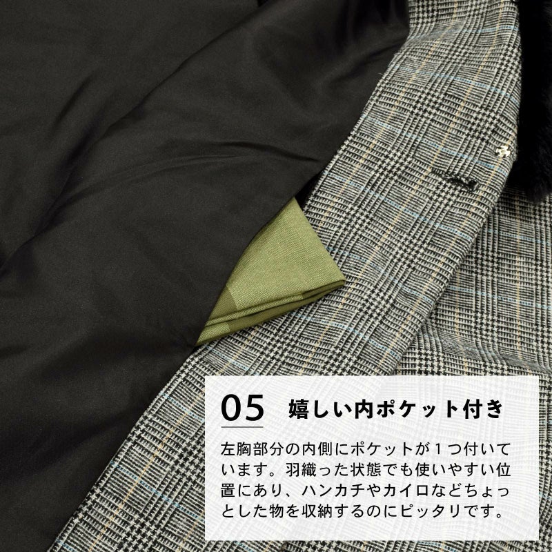 左胸部分の内側にポケットが1つ付いています。羽織った状態でも使いやすい位置にあり、ハンカチやカイロなどちょっとした物を収納するのにピッタリです。