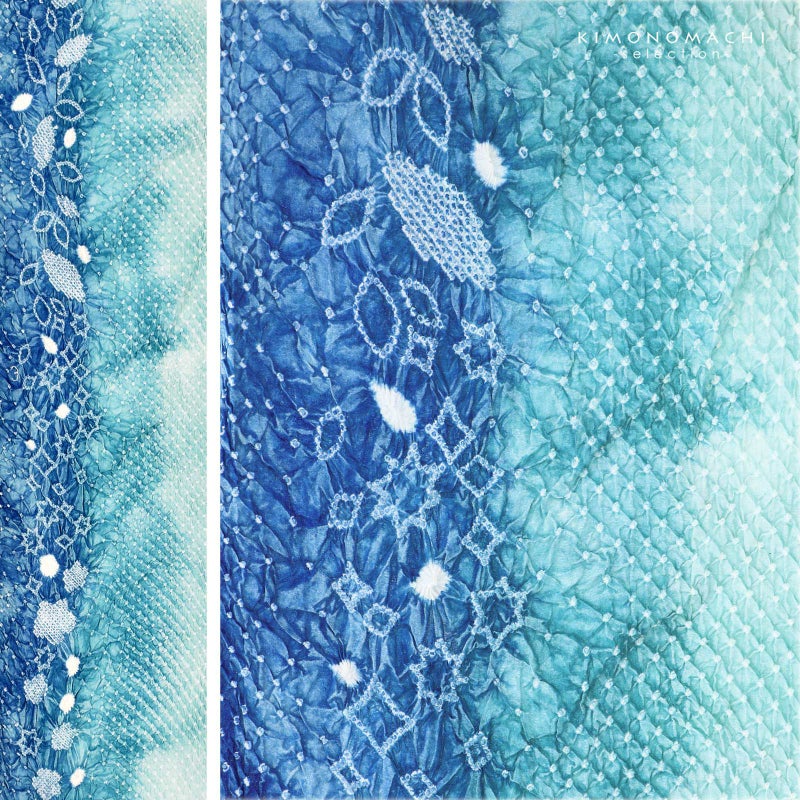 【色柄】藍色と水色、薄藍色の縦ぼかしに白の絞りで表現された星や花のような模様。童話的なかわいらしさがあります。