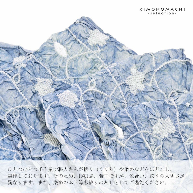 ※ひとつひとつ手作業で職人さんが括り(くくり)や染めなどをほどこし、製作しております。そのため、1点1点、若干ですが、色合い、絞りの大きさが異なります。また、染めのムラ等も絞りのあじとしてご堪能ください。