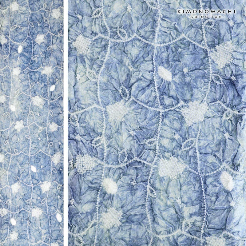【色柄】グレイッシュな薄青の地に白。細かな白の絞りを連ねたお花の格子。