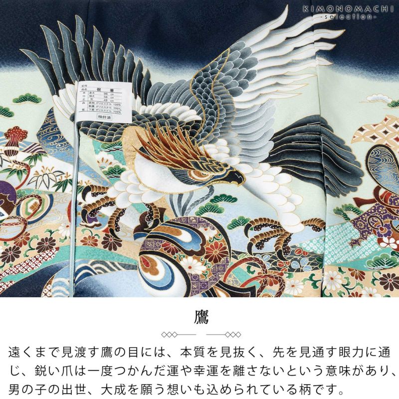 着物は細かな地紋のある濃紺地に淡い青磁色、水色の腰替わり。背には藍鉄色や灰色、白の翼を広げた茶の冠羽の鷹。金彩や刺繍が煌びやかさと重厚さを添えています。深緑や青磁色、ベージュに吉祥紋の入った束ね熨斗。さらに黒、滅紫色、茶色など多彩な色使いの小槌や兜、巾着など。襦袢は白色に疋田文様の地紋。袖の振りは疋田文様の地紋の淡い水色。