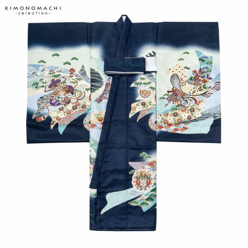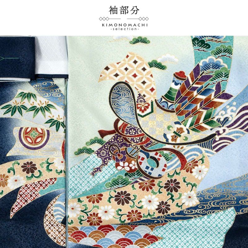 男の子らしく勇ましい、カッコイイ雰囲気。美しい発色の生地に美しい模様。長襦袢の中に水色の振りが入っており、お洒落な雰囲気をプラスしてくれます。