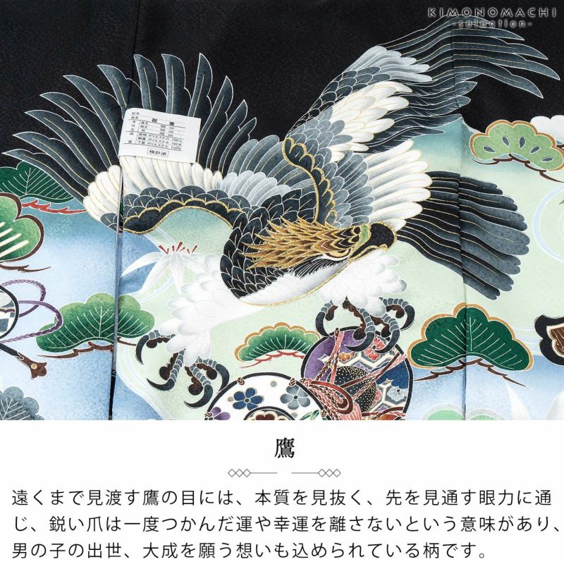 着物は細かな地紋のある黒地。淡い青磁色、水色の腰替わりに流水紋。背には藍鉄色や灰色、白の翼を広げた茶の冠羽の鷹。金彩や刺繍が煌びやかさと重厚さを添えています。深緑や青磁色、ベージュに吉祥紋の入った束ね熨斗。さらに黒、滅紫色、茶色など多彩な色使いの小槌や兜、巾着など。襦袢は白色に疋田文様の地紋。袖の振りは疋田文様の地紋の淡い水色。