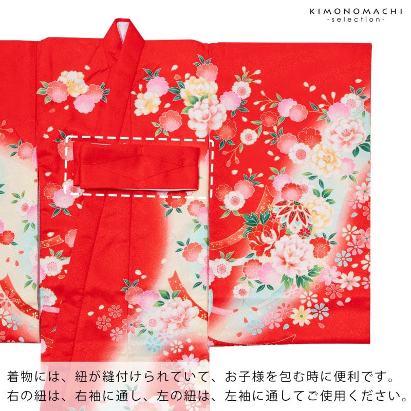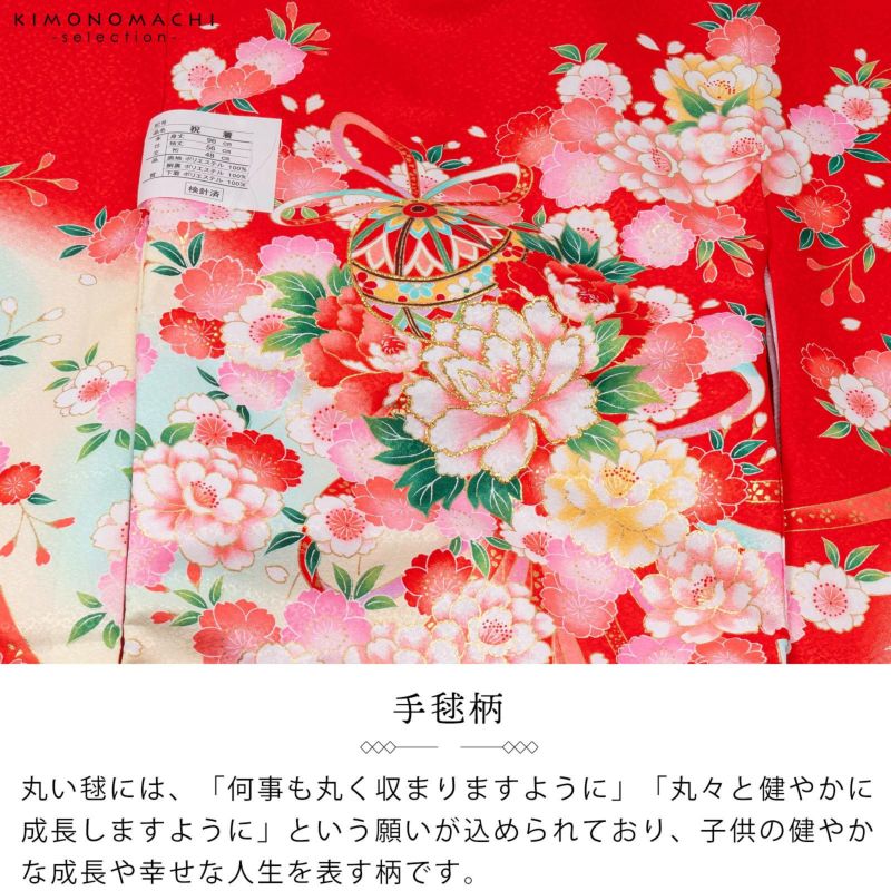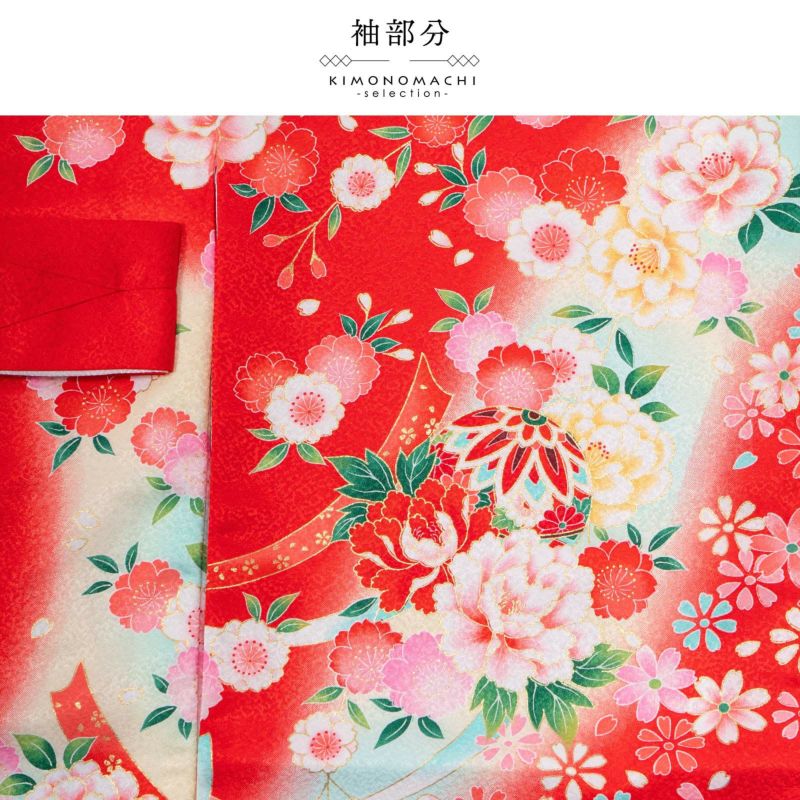 やや柔らかい赤地に淡い黄色、水色のぼかし。背には赤に黄色や水色、薄紫などの配色の鞠に組紐。赤や薄ピンクの牡丹。黄色や赤、ピンクなどの鞠に牡丹や八重桜などの花々が全体に表現されています。ポイントの刺繍や金彩が豪華さと煌びやかさを添えます。襦袢は薄ピンク。袖の振りは赤。