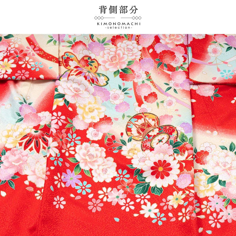 やや柔らかい赤地に淡い黄色、水色のぼかし。背には赤に黄色や水色、薄紫などの配色の鼓に、赤や薄ピンクの牡丹。吉祥紋の入った束ね熨斗。黄色や赤、ピンクなどの鼓に牡丹や八重桜などの花々が全体に表現されています。ポイントの刺繍や金彩が豪華さと煌びやかさを添えます。襦袢は薄ピンク。袖の振りは赤。