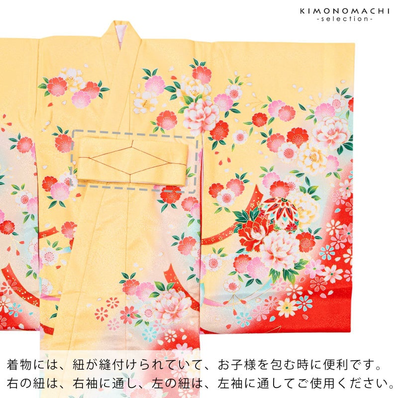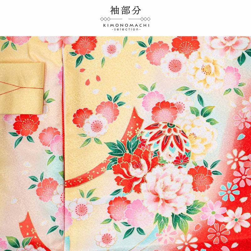 明るいクリームイエロー地に淡い黄色、水色、赤のぼかし。背には赤に黄色や水色、薄紫などの配色の鞠に組紐。赤や薄ピンクの牡丹。黄色や赤、ピンクなどの鞠に牡丹や八重桜などの花々が全体に表現されています。ポイントの刺繍や金彩が晴れやかさと煌びやかさを添えます。襦袢は薄ピンク。袖の振りは赤。