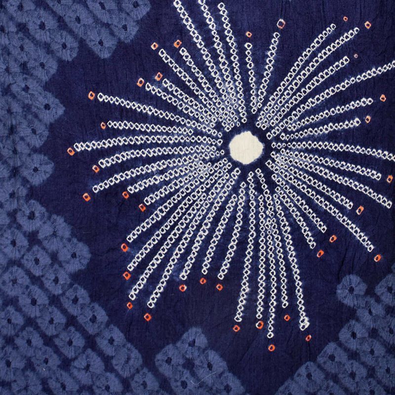 【色柄】紺の蜘蛛絞りに浅い藍色を掛けた地。紺に白、朱色の挿し色の花火の飛び柄。
