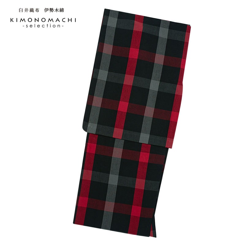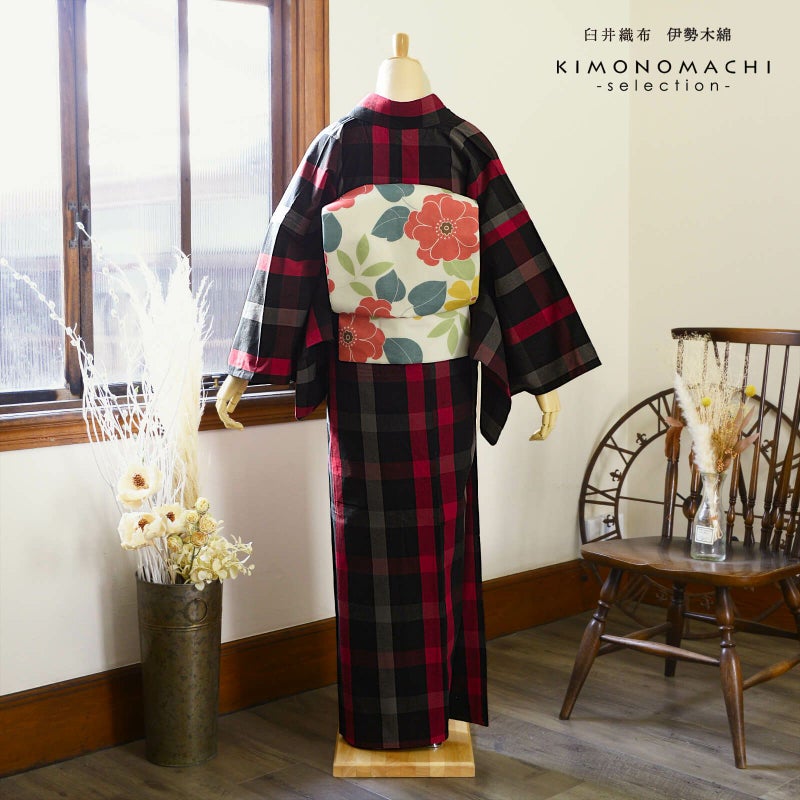 伊勢木綿 洗える着物 単品「格子黒×赤」お仕立て上がり 木綿きもの 日本製 三重県 伝統工芸品 単衣 綿 カジュアル チェック 小紋 レディース キモノ kimono