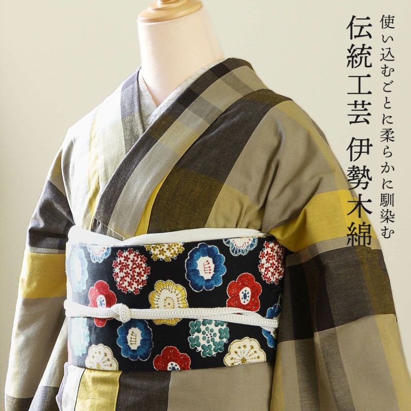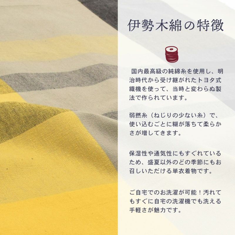 伊勢木綿 洗える着物 単品「格子淡黄×グレー×墨色」お仕立て上がり 木綿きもの 日本製 三重県 伝統工芸品 単衣 綿 カジュアル チェック 小紋 レディース キモノ kimono