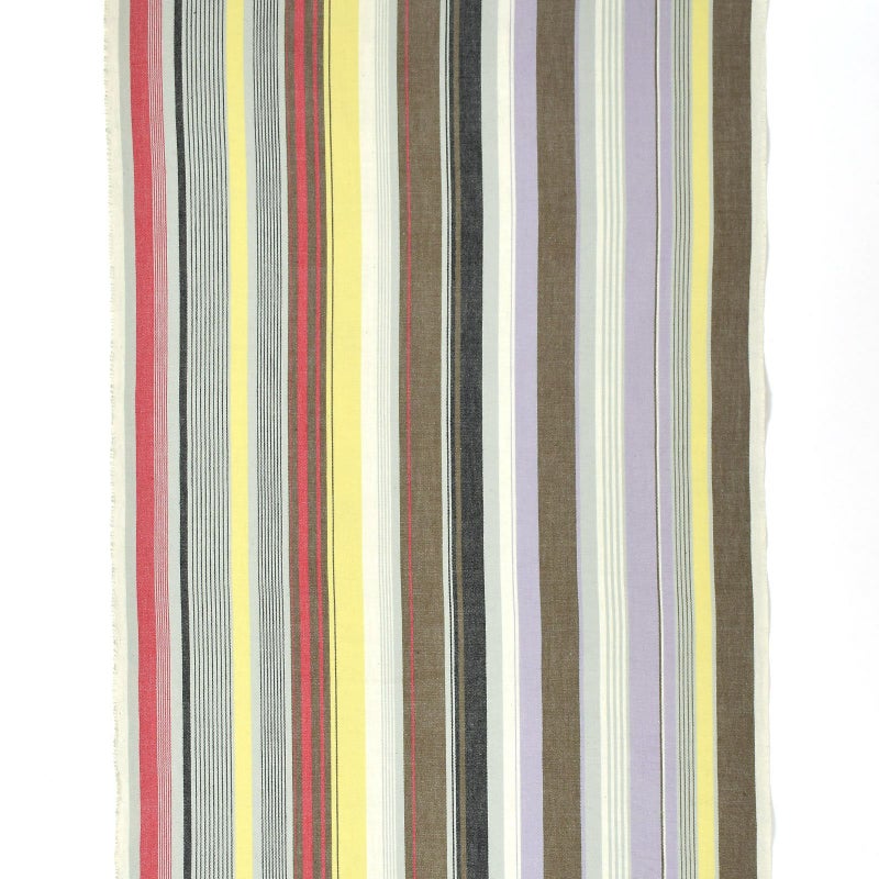 【色柄】浅い生成り色の地に媚茶や薄紫に淡い黄色、黒、赤、グレーのランダムな縦縞。グレイッシュな色が現代的な雰囲気のストライプです。