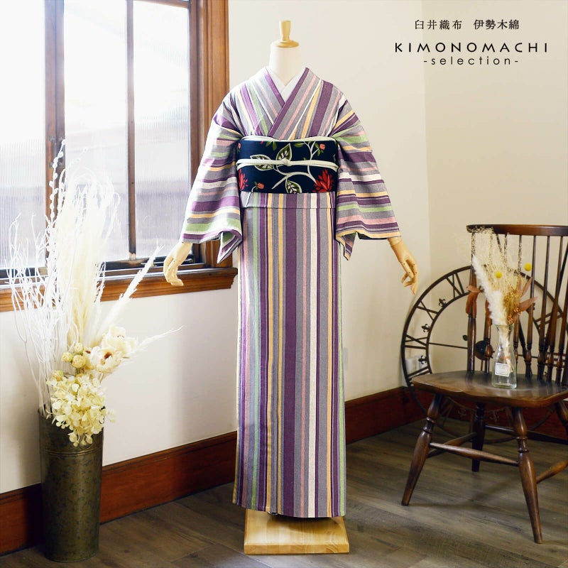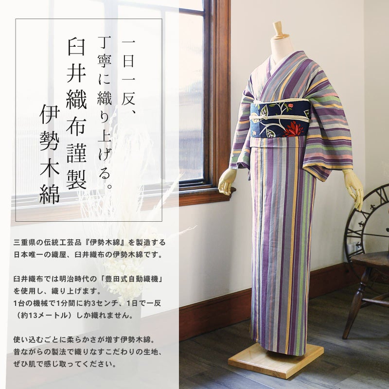 伊勢木綿 洗える着物 単品「やたら縦縞 灰色×紫(紫雲)」お仕立て上がり 木綿きもの 日本製 三重県 伝統工芸品 単衣 綿 カジュアル チェック 小紋 レディース キモノ kimono