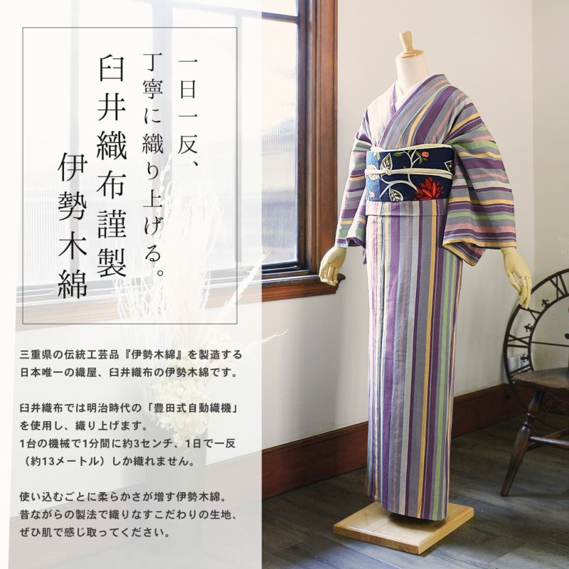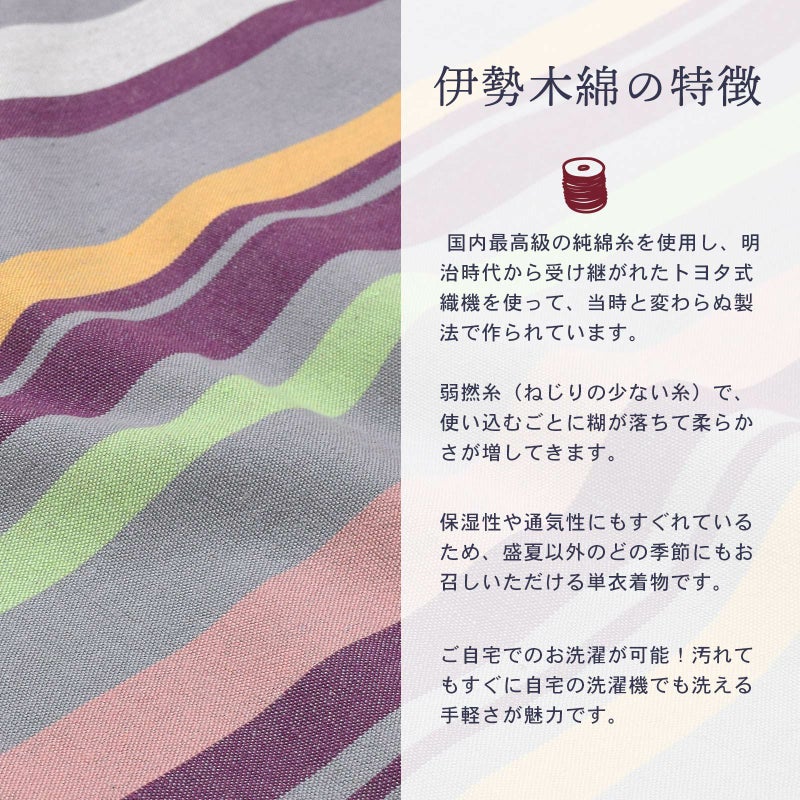 やわらかく、どこかぬくもりが感じられる「伊勢木綿」のお仕立て上がり単衣着物 伊勢木綿 洗える着物 単品「やたら縦縞 灰色×紫(紫雲)」お仕立て上がり 木綿きもの 日本製 三重県 伝統工芸品 単衣 綿 カジュアル チェック 小紋 レディース キモノ kimono【メール便不可】
