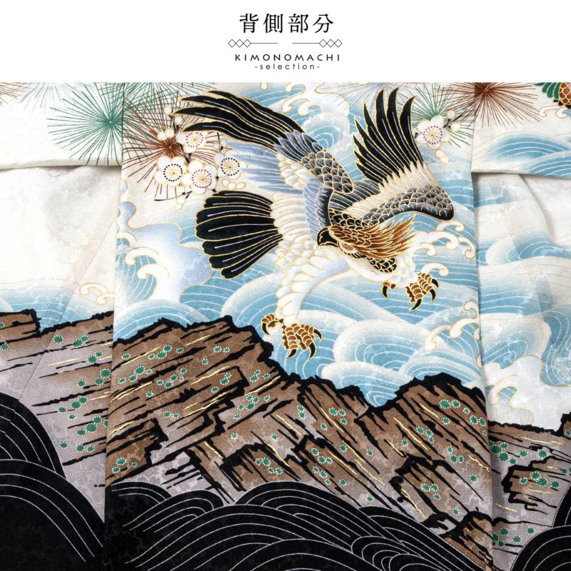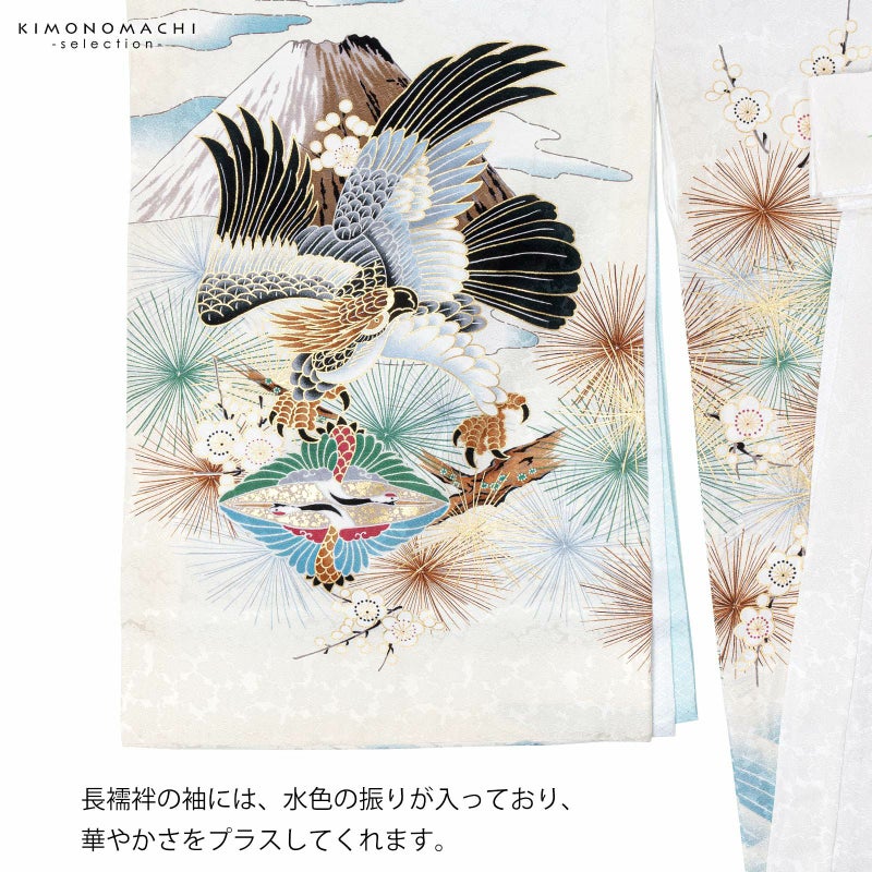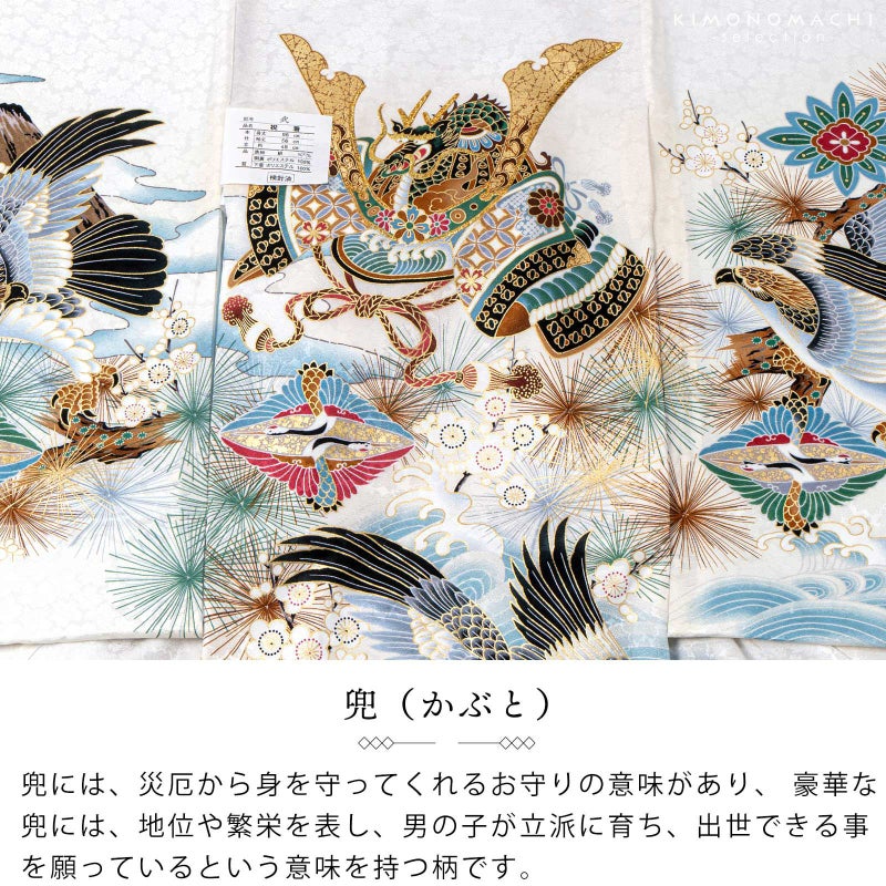 男の子らしく勇ましい、カッコイイ雰囲気。美しい発色の生地に美しい模様。長襦袢の中に水色の振りが入っており、お洒落な雰囲気をプラスしてくれます。