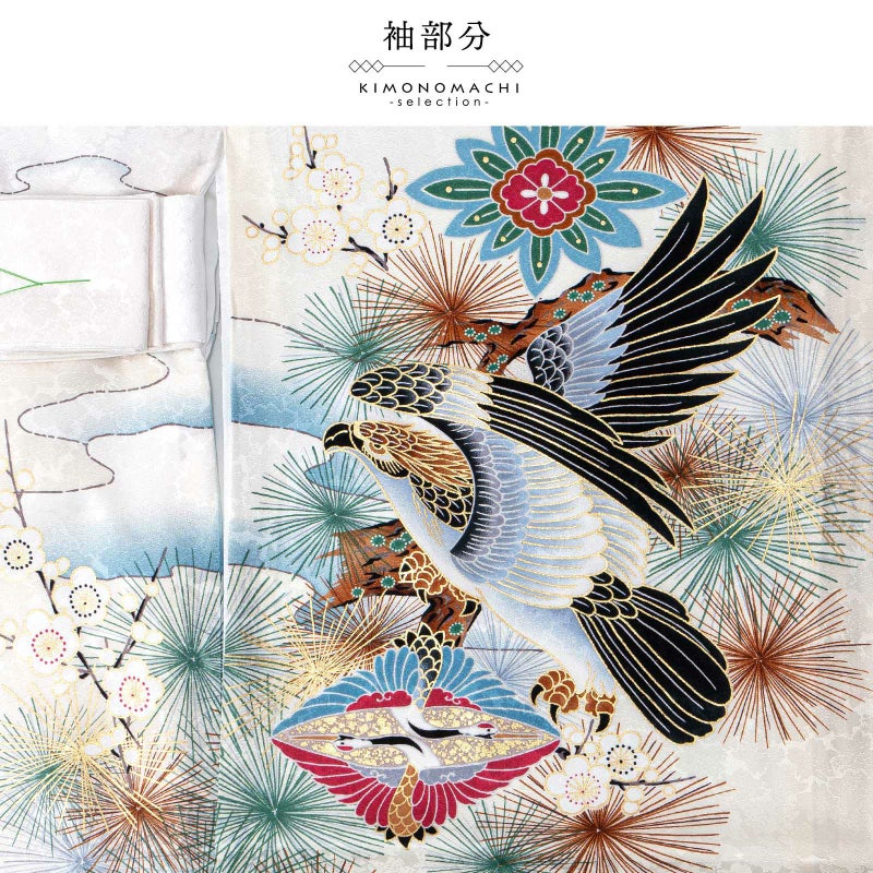 着物は桜の地紋のある白色の地にオフホワイトの腰替わり。背には、緑色の龍、緑に水色、白、中紅色の兜。金彩や刺繍が上品な煌びやかさを添えています。茶色に緑の松葉、白梅、群青色に中紅色の向かい鶴菱など。さらに水色や茶色、黒色の荒磯に鷹。襦袢は白色に疋田文様の地紋。袖の振りは疋田文様の地紋の淡い水色。