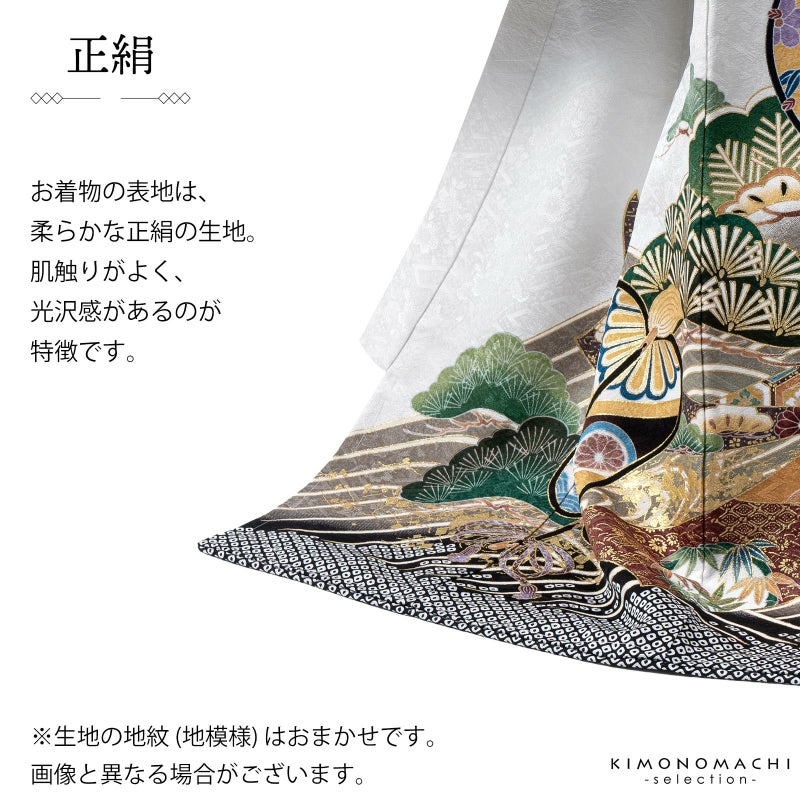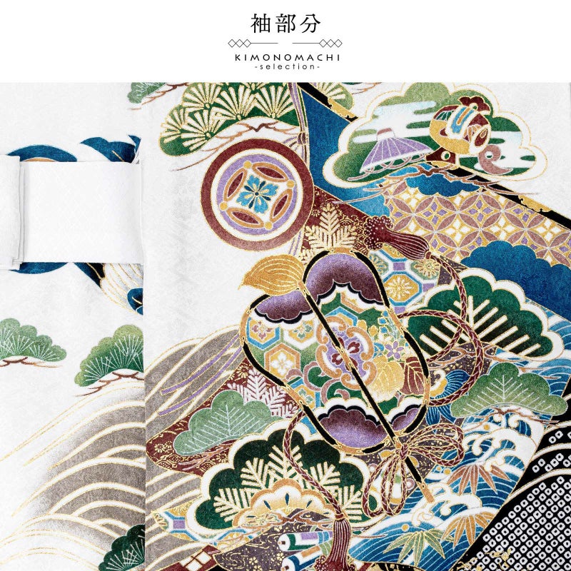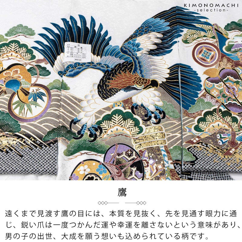 着物は細かな地紋のある白地、裾は黒の疋田。背には黒や濃紺、青色、白の翼を広げた茶の冠羽の鷹。金彩や刺繍が煌びやかさと重厚さを添えています。深緑や青磁色、ベージュに吉祥紋の入った束ね熨斗。さらに白、紺、薄紫色など多彩な色使いの鼓に、鞍や軍配など。緑や深い紫紺の松紋。襦袢は白色に疋田文様の地紋。袖の振りは疋田文様の地紋の淡い水色。