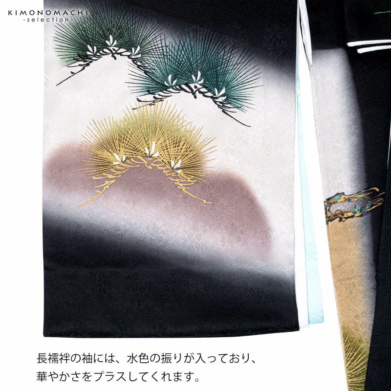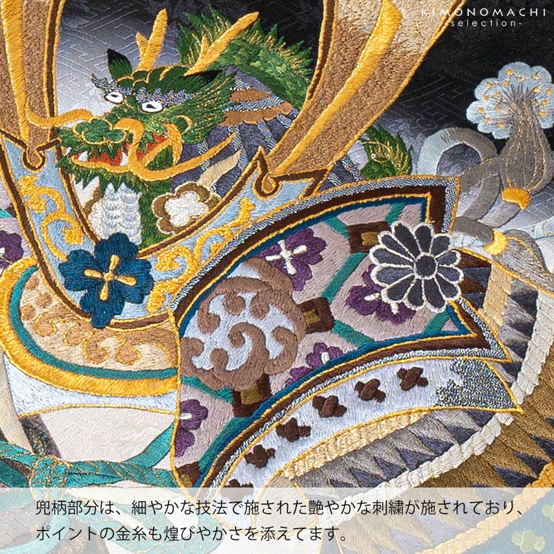 着物は紗綾形に花の地紋、黒地にベージュの腰替わり。背には、刺繍で表現された緑の龍、紫、白茶、紺鼠色などの配色の兜。細やかな技法で施された艶やかな刺繍にポイントの金糸が煌びやかさを添えます。黒に深緑や茶色の手描き調の松に金彩、銀彩が荘厳な雰囲気。さらに金茶や赤、紫、金泥、銀泥の小槌。襦袢は白色に疋田文様の地紋。袖の振りは疋田文様の地紋の淡い水色。