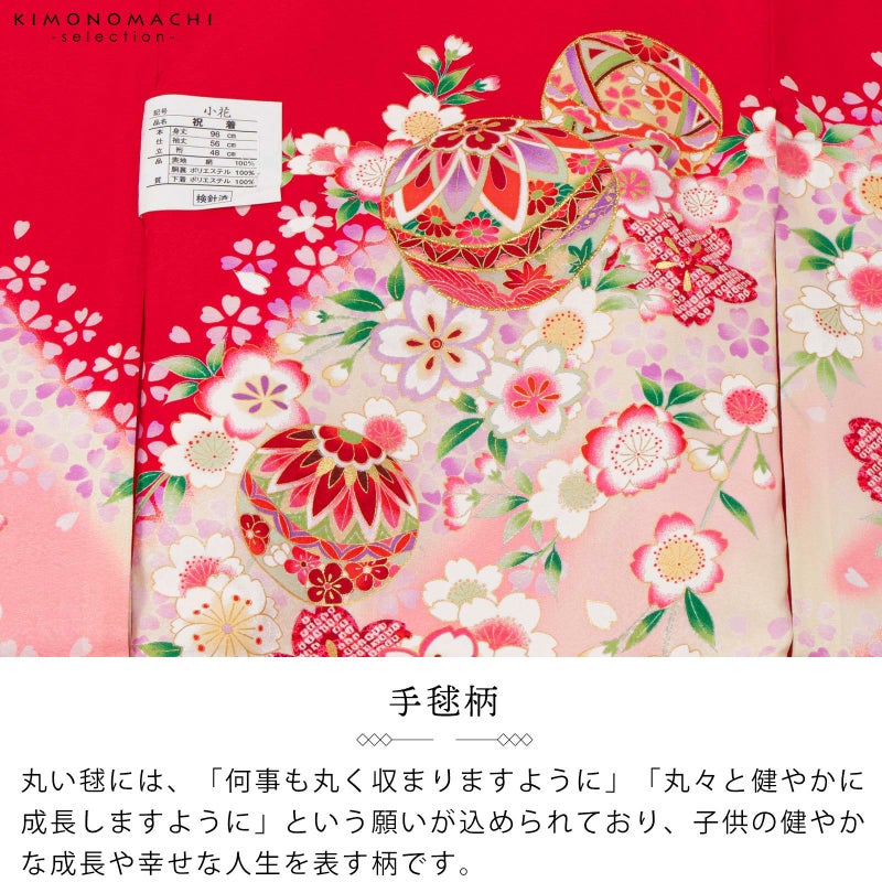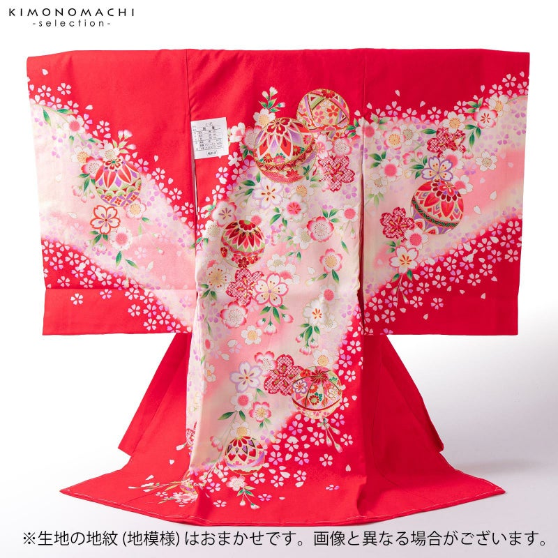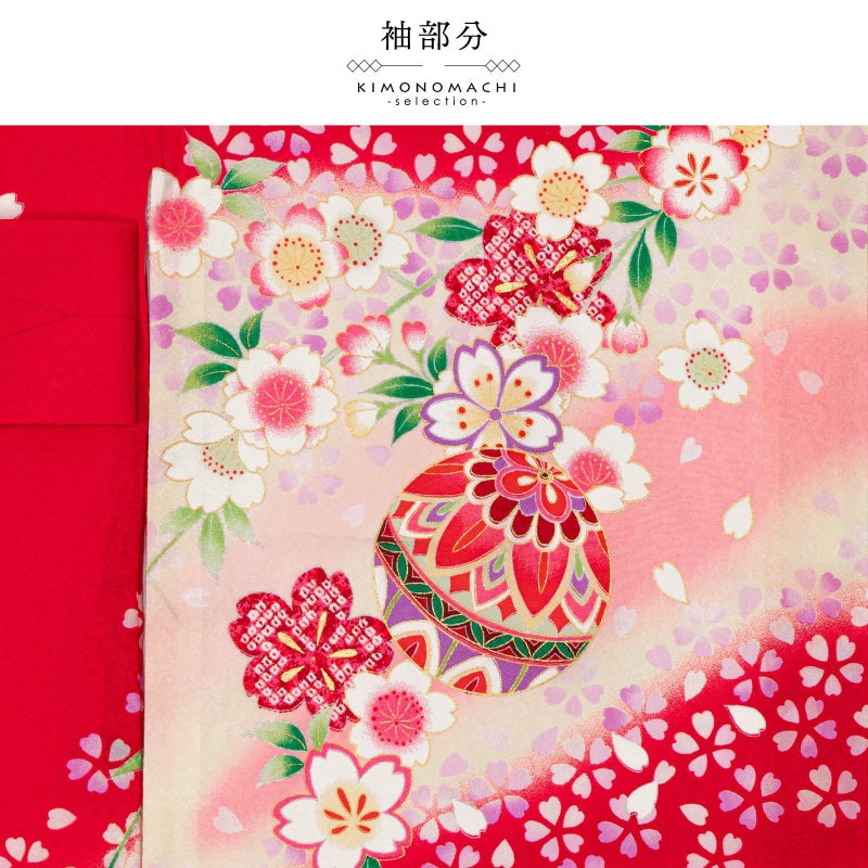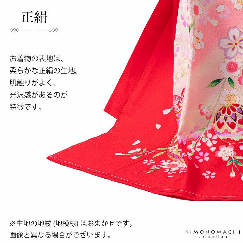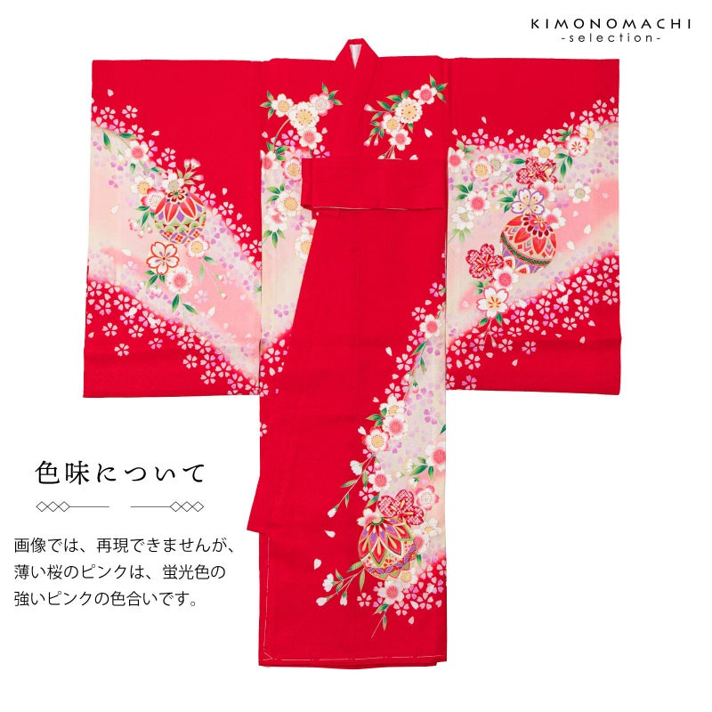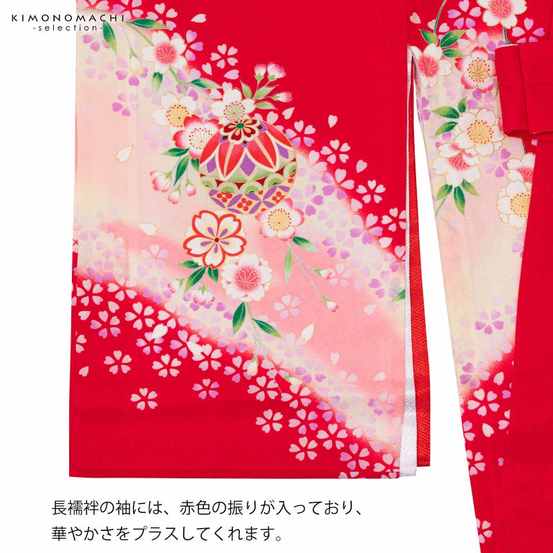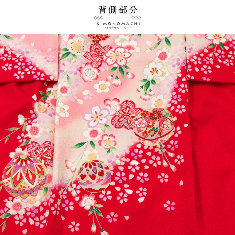 赤の地に斜めに入った淡いピンクや淡いクリーム色のぼかし。赤や紫、ピンク、エンジ色、薄緑色などの手鞠に桜の花々。白や薄紫、ピンク、淡い黄色の華やかな小花にポイントの金彩が輝きを添えます。襦袢は薄ピンク。振りは赤。
