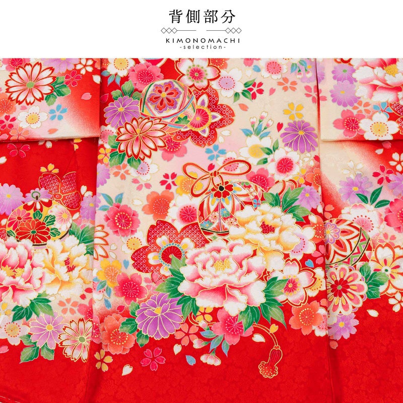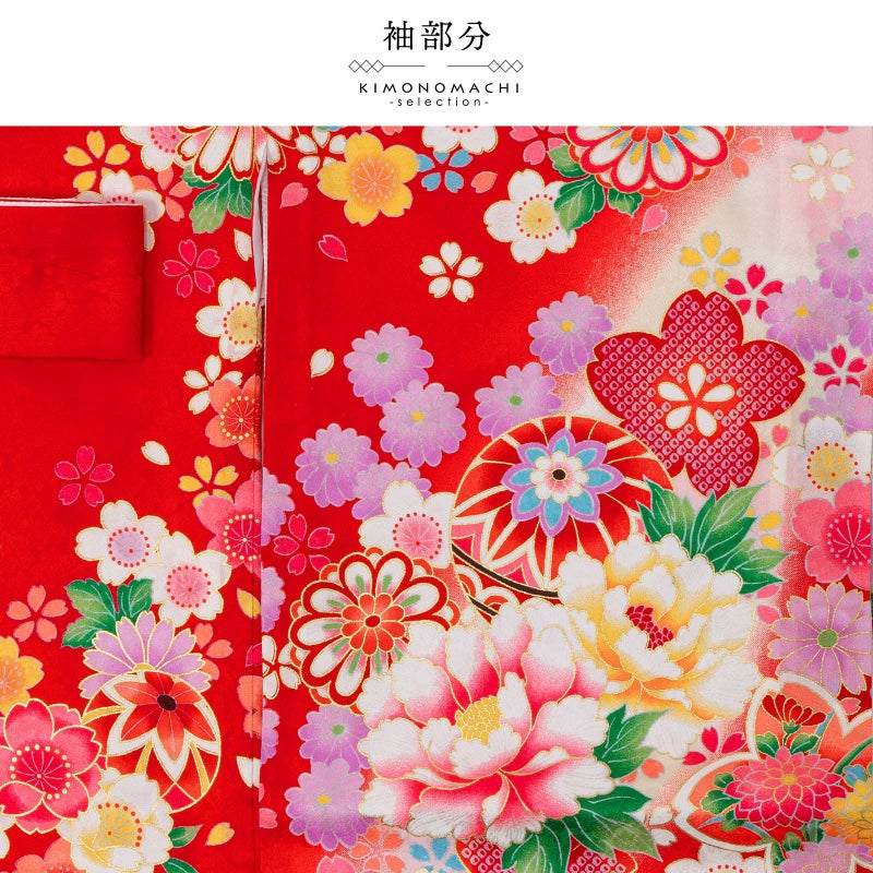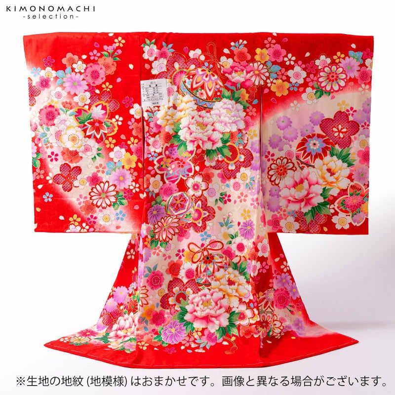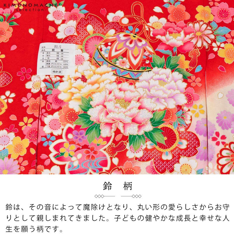 赤の地に斜めに入った淡いピンクや淡いクリーム色のぼかし。濃いピンクや赤、水色、黒が入った鈴に牡丹の花。金駒刺繍やラメ糸の刺繍が豪華な雰囲気。白や赤、緑、薄紫、ピンク、淡い黄色の桜や菊の花紋、ポイントに金彩。襦袢はごく淡いピンク。振りは赤。